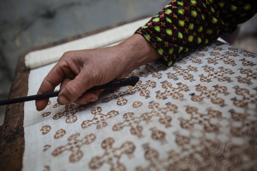 Đi loanh quanh trong làng đến một ngôi nhà đang có mùi hương sáp ong nấu ở cửa, chúng tôi xin phép vào thăm thì gặp cô Vàng Thị Mai đang nói chuyện với một cụ già. Cụ đang chấm bút vào sáp ong nóng, kẻ thật khéo những đường thẳng trên vải. Cô Mai kể về công đoạn vẽ sáp ong, trong 41 công đoạn dệt lanh thì đây là công đoạn được xem như làm nên hồn cốt tấm vải lanh với bút vẽ đặc chủng có ngòi là miếng đồng dẹt. Thời gian vẽ thành một chiếc váy in hoa văn đủ sắc thường là cả tháng, thậm chí có khi vài tháng… Và, cụ già này chính là người nắm giữ tinh hoa của làng nghề: nghệ nhân Sùng Thị Cờ, năm ấy cụ đã 94 tuổi với bàn tay gầy guộc nhưng thật khéo léo. Cô Mai nói rằng thật may mắn Lùng Tám không bị thất truyền nghề dệt lanh vì có các nghệ nhân cao tuổi như cụ Sùng Thị Cờ, cụ Giàng Thị Mỉ đã truyền lại những kinh nghiệm quý báu cho dân làng.