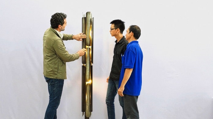 RLS: Đúng vậy. Đằng sau những đường nét thanh mảnh trong thiết kế chính là những tay nghề bậc thầy để đảm bảo cùng lúc tính thẩm mỹ và độ vững chắc của sản phẩm. Có thể kể đến kỹ thuật làm mộc vô cùng tỉ mỉ để tạo nên những cấu trúc chắc khỏe, những đường cong uốn lượn, những khớp nối chính xác, hay những vân gỗ đồng điệu với màu của sơn mài. Kỹ thuật cơ khí kết hợp kim loại với sơn mài cũng được thể hiện rất độc đáo trong tác phẩm đèn Sunny, nhằm đáp ứng một ý tưởng táo bạo của nhà thiết kế. Nhưng vượt trội hơn cả vẫn là kỹ thuật sơn mài để tạo nên nhiều hiệu ứng phong phú, như hiệu ứng mài xước với 5 gam màu ấn tượng, hiệu ứng cẩn ốc nhuộm màu lan tỏa mang vẻ đẹp bí ẩn của những dải ngân hà, hiệu ứng cẩn veneer theo hoa văn hình dẻ quạt chính xác đến từng chi tiết hay hiệu ứng nhuộm màu để lộ vân gỗ trên mảng rộng v.v… Đây đều là những kỹ thuật khó do Hanoia tự nghiên cứu và phát triển để tạo nên triết lý Việt của riêng mình.