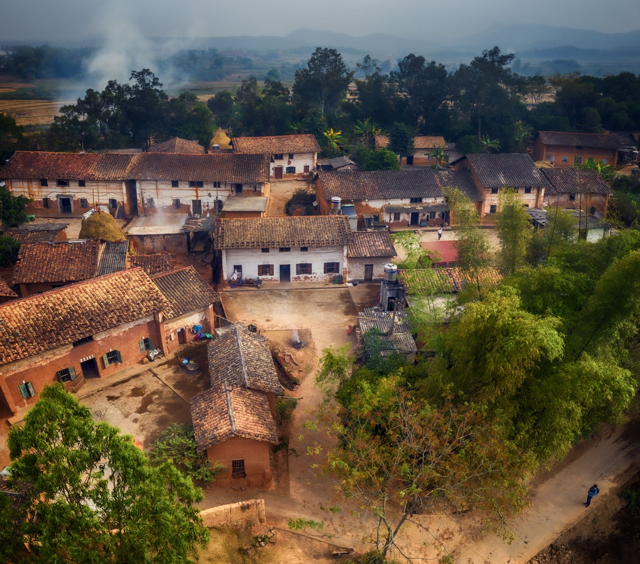 Nhưng những ngôi nhà đất Vân Nam, đặc biệt từ Côn Minh đến Đại Lý, Lệ Giang thường dồn thành một làng có từ vài chục đến trăm ngôi nhà, tọa lạc trên sườn đồi, gần như không có không gian hở, khi tất cả các nhà sát tường nhau, và chồng lên nhau theo địa hình đồi núi.