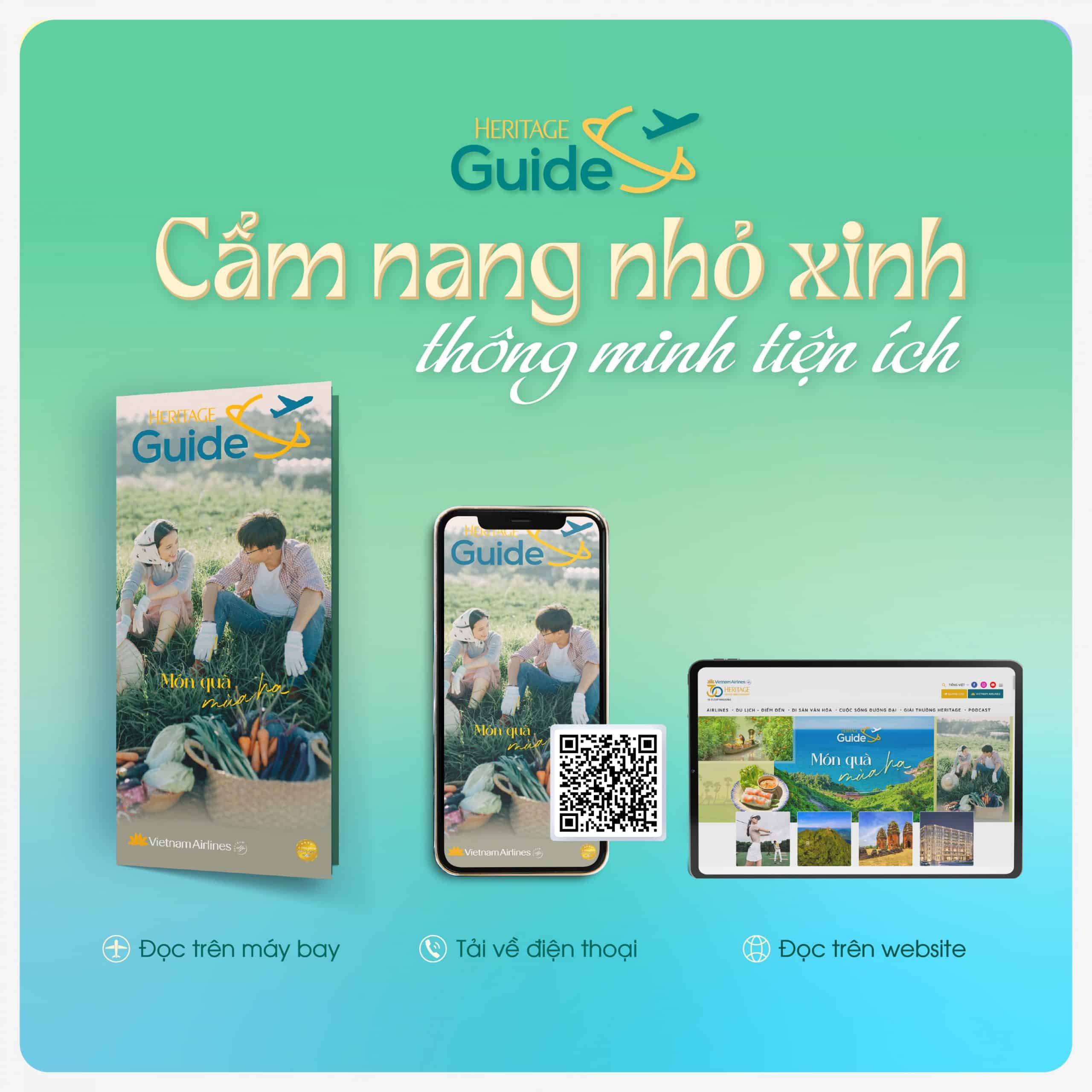 Hành khách và bạn đọc yêu du lịch có thể tìm đọc “Heritage Guide – Món quà mùa hạ” trên các chuyến bay của Vietnam Airlines từ 15/05/2024, hoặc tải phiên bản điện tử của ấn phẩm này về điện thoại tại website Heritage.