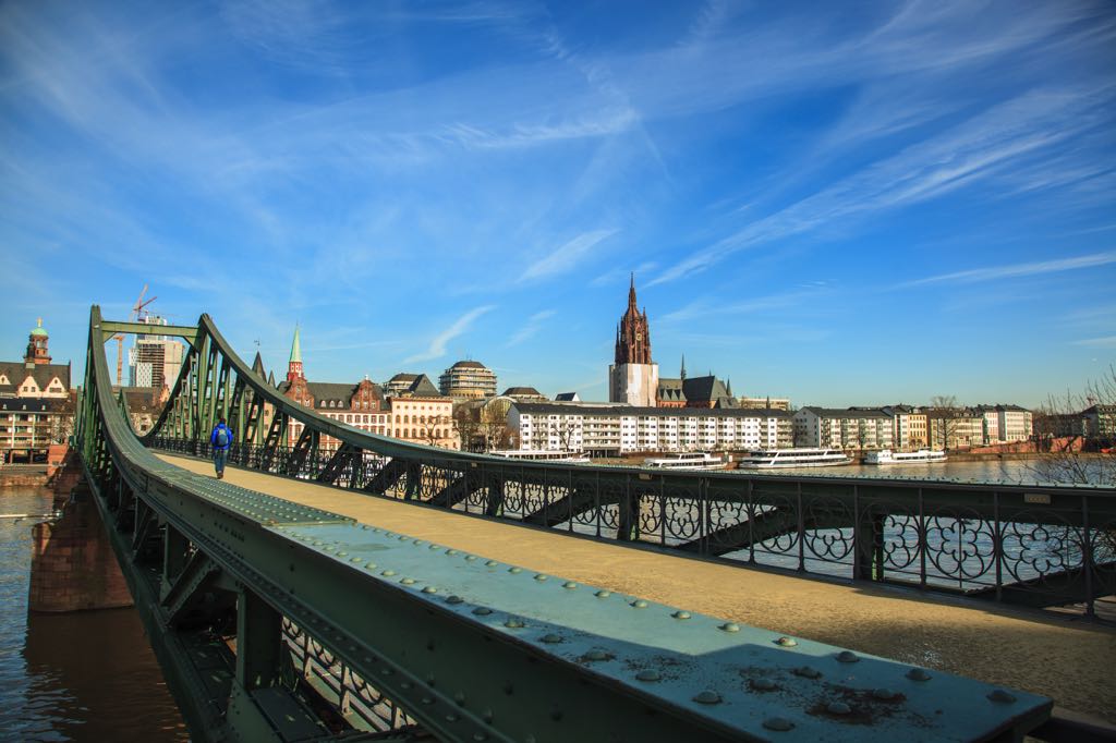 Eiserner Steg là một cây cầu đi bộ kết nối phố cổ Römerberg với quận Sachsenhausen. Cầu sắt này được xây dựng vào năm 1868, dài 170m và bao gồm khung đỡ bằng thép đúc với hai cầu tàu. Năm 1993, cầu đã được cải tạo lại hoàn toàn. Từ cầu Eiserner Steg có thể ngắm được toàn cảnh hai bên bờ sông. Khi tản bộ qua cầu, bạn hãy tận hưởng khung cảnh tuyệt đẹp của đường chân trời phía bắc và khu Museumsufer hay khu bảo tàng bên bờ sông ở phía nam. Cây cầu gần 150 năm tuổi này cũng là một địa chỉ để những đôi lứa gắn những ổ khóa – biểu tượng của sự gắn kết tình yêu. Sắc màu của các ổ khóa tình yêu với những trang trí sinh động đã khiến cho cây cầu càng thêm lãng mạn. Cây cầu tình yêu Eiserner Steg trở thành điểm tham quan độc đáo, thu hút khách du lịch đến với nước Đức.