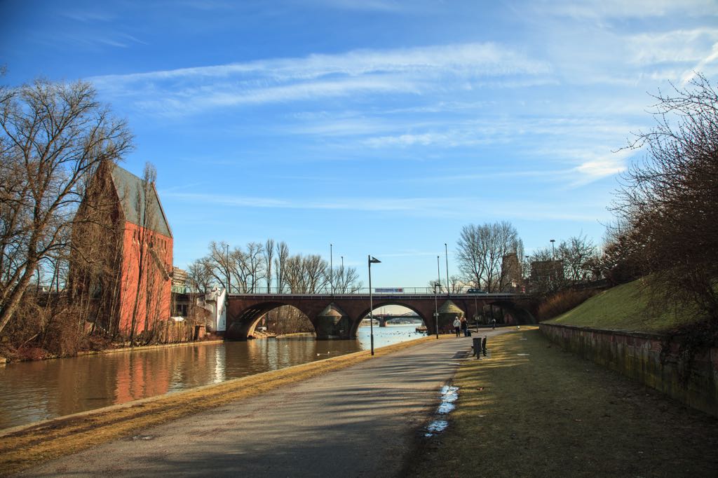 Khi bạn bỏ sau lưng khu phố tài chính và đi bộ dọc bờ sông Main, một thế giới khác sẽ mở ra quanh các cây cầu nối quận trung tâm phố cổ Altstadt bên bờ phải, với quận Sachsenhausen bên bờ trái của con sông. Đứng trên cây cầu đá mang tên Alte Brücke, nhìn qua bên tả ngạn dòng sông Main, bạn có thể ngắm được toàn cảnh di sản kiến trúc tương phản nhưng nên thơ của Frankfurt. Những tòa tháp mang lối kiến trúc gothic của các nhà thờ và những ngôi nhà thời trung cổ La Mã đan xen với những ngôi nhà vuông vức kiểu Bauhaus ngay bờ sông, kết hợp với những cao ốc hiện đại lung linh phía sau của khu phố tài chính. Xa hơn là hai cây cầu đi bộ nổi tiếng: cầu sắt Eiserner Steg và cầu dây treo Holbeinsteg. Phía sau cầu Alte Brücke, có thể chiêm ngưỡng cây cầu tháp bê tông lệch trục đặc biệt Flößerbrücke.