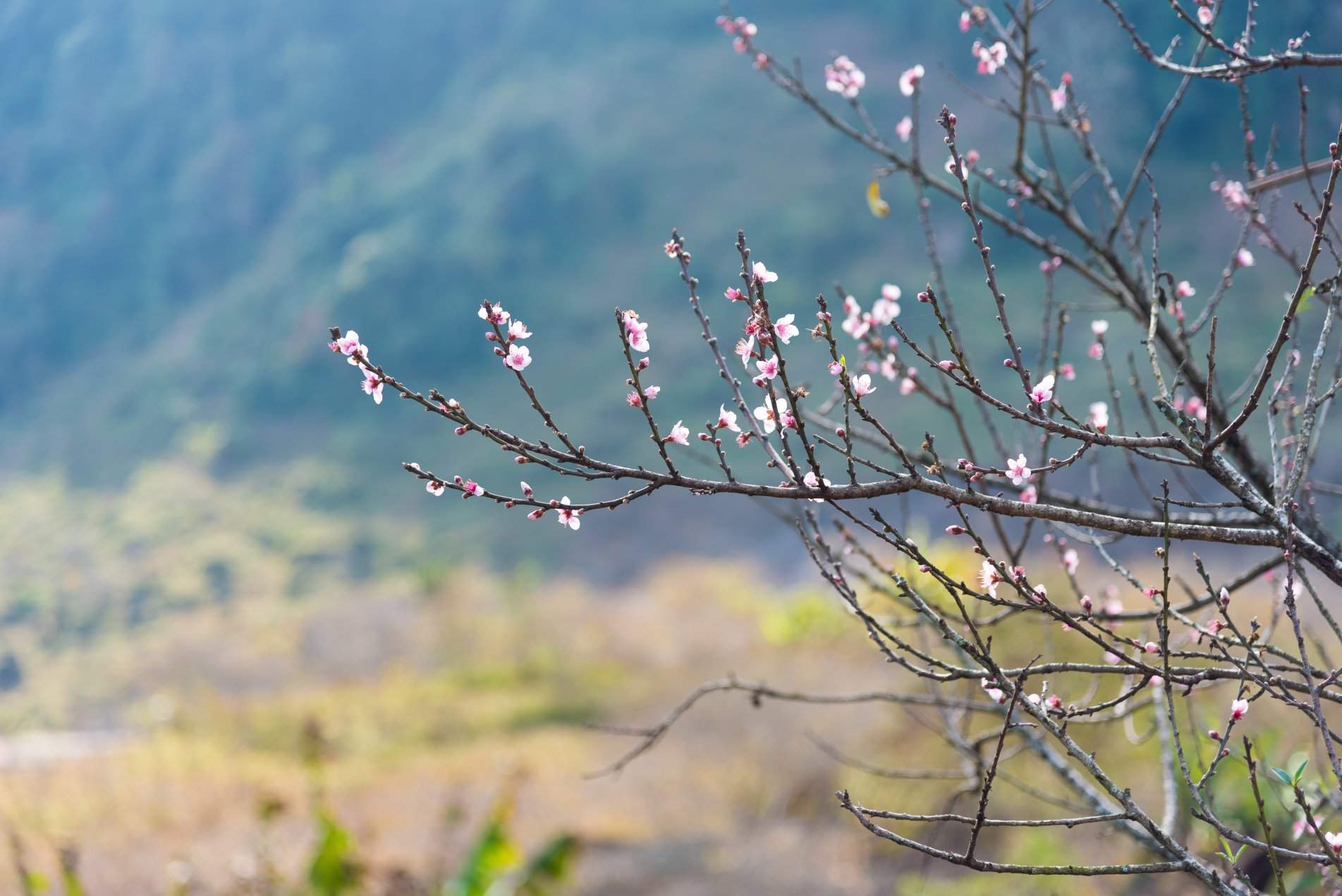 Những mùa hoa dại qua đi, dù vẫn đang độ tiết đông nhưng Mộc Châu như đón xuân sớm cùng những cánh đào Pháp phớt hồng nở rộ vào tầm cuối tháng 12 đầu tháng 1. Vùng đất cao nguyên này có nhiều giống đào, đào Pháp được trồng chủ yếu để thu hoạch quả nhưng mùa hoa của nó cũng để lại dấu ấn đậm nét trong tôi vì nó như những sứ giả mùa xuân báo tin sớm. Những cánh hoa đơn, hồng nhạt nở trước giống hoa đào bản địa như tô điểm cho núi rừng. Du khách có thể đi tìm xuân sớm ở bản Lóng Luông hay đoạn giáp ranh giữa xã Tân Lập và thị trấn Nông trường Mộc Châu.