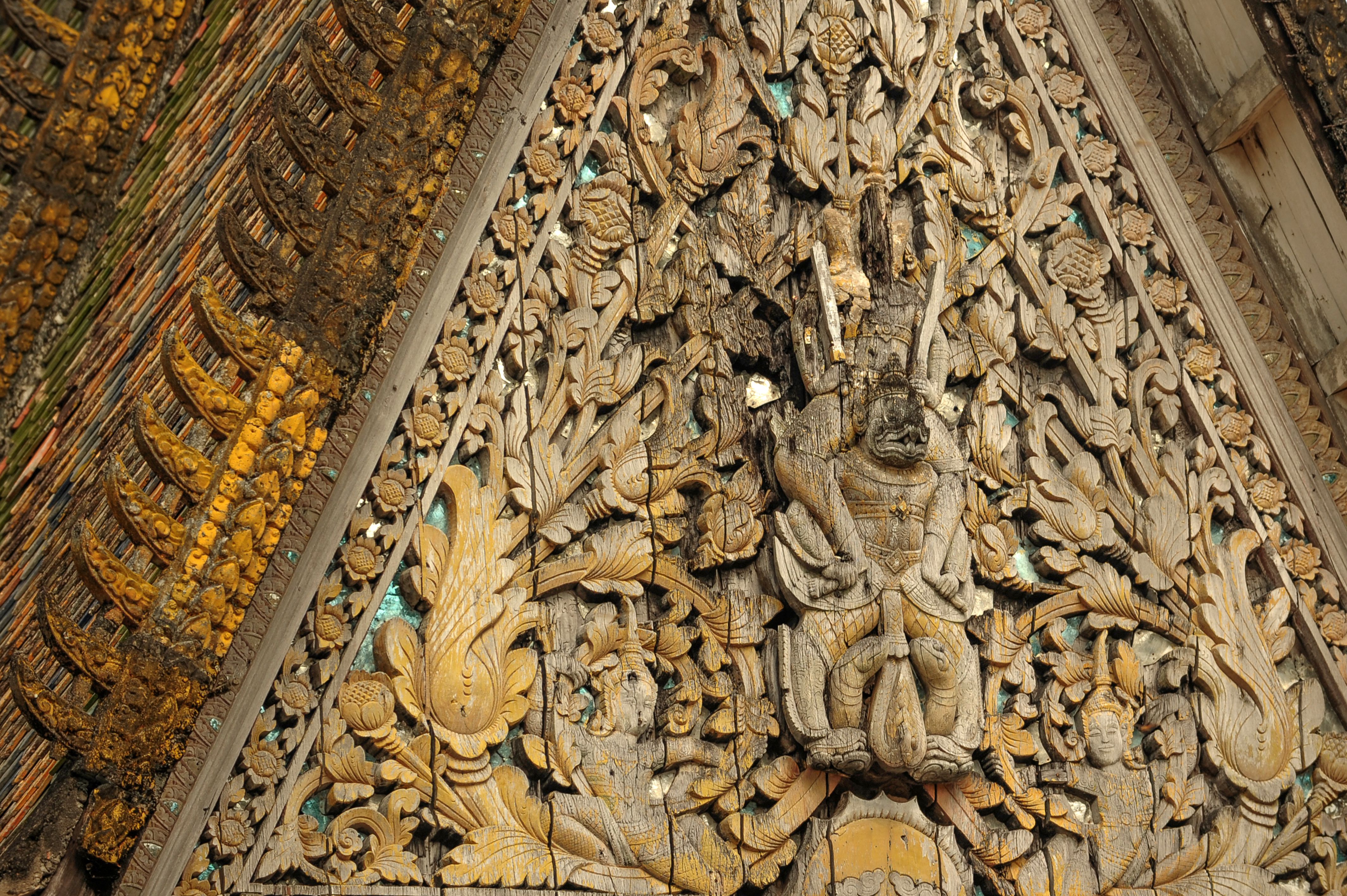 Dường như người Khmer không chỉ xây chùa làm nơi thờ phụng, mà còn là nơi phô diễn kỹ năng điêu luyện về trang trí nghệ thuật. Một đặc điểm dễ nhận thấy của các ngôi chùa Khmer là ngay từ bức tường bao cho đến chính điện đều được trang trí bằng hệ thống tượng, phù điêu. Ngoài yếu tố mỹ thuật, các hình tượng nghệ thuật ở đây còn là kho tàng văn hóa tri thức Phật giáo. Hệ thống trang trí như các môtíp hoa văn, hình tượng đều ngầm định hướng tới thành tựu hướng thiện, tôn vinh Phật pháp. Đầu tiên là các vị thần bước ra từ các truyện thần thoại của Ấn Độ. Các hình tượng này đều có hình dáng dữ dằn, với xuất thân là ác quỷ như Reahu (quỷ Dạ xoa), Yeak thường được gọi là Chằn, rắn thần Naga năm đầu. Các hình tượng này xuất hiện ngay trước cổng chùa hoặc xung quanh chính điện với chức năng bảo hộ Phật pháp, song lại ẩn chứa thông điệp về quyền năng giáo hóa của đức Phật, hóa giải được cái ác thành điều thiện. Vòng tiếp theo xung quanh chính điện thể hiện sự thăng hoa ở cõi Phật. Ở đây, trên các cột đỡ mái là hình tượng các tiên nữ hoặc chim thần Krud, đều mang hình dáng cơ thể thiếu nữ, trong trang phục truyền thống của người Khmer, với quyền năng bay lượn thể hiện qua đôi cánh, truyền bá đạo pháp khắp thế gian. Người Khmer theo phái hệ phật giáo Nam Tông nên ban thờ chính điện khá đơn giản, chỉ có duy nhất một pho tượng Thích Ca được đặt trên bệ thờ được trang trí bằng các hình kỷ hà, hoa lá, nhưng trên các cột, tường và trần nhà được trang trí công phu bằng các điển tích Phật. Trên đầu hồi chính điện thường được trang trí phù điêu với linh vật rắn Naga hay hoa văn trang trí cân đối hai bên tượng trưng cho giá trị cao nhất là trí tuệ được hội tụ trong kinh Phật.