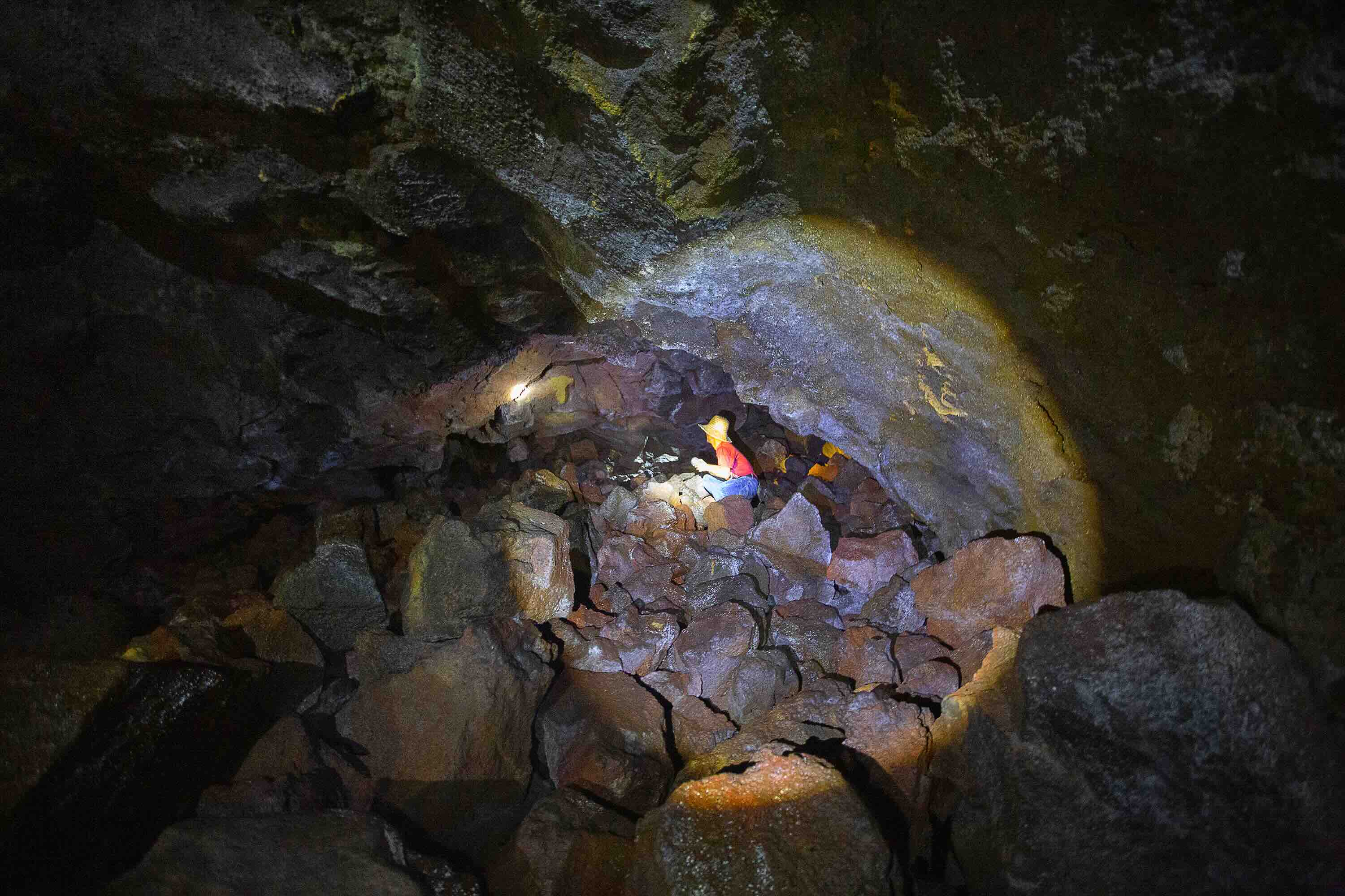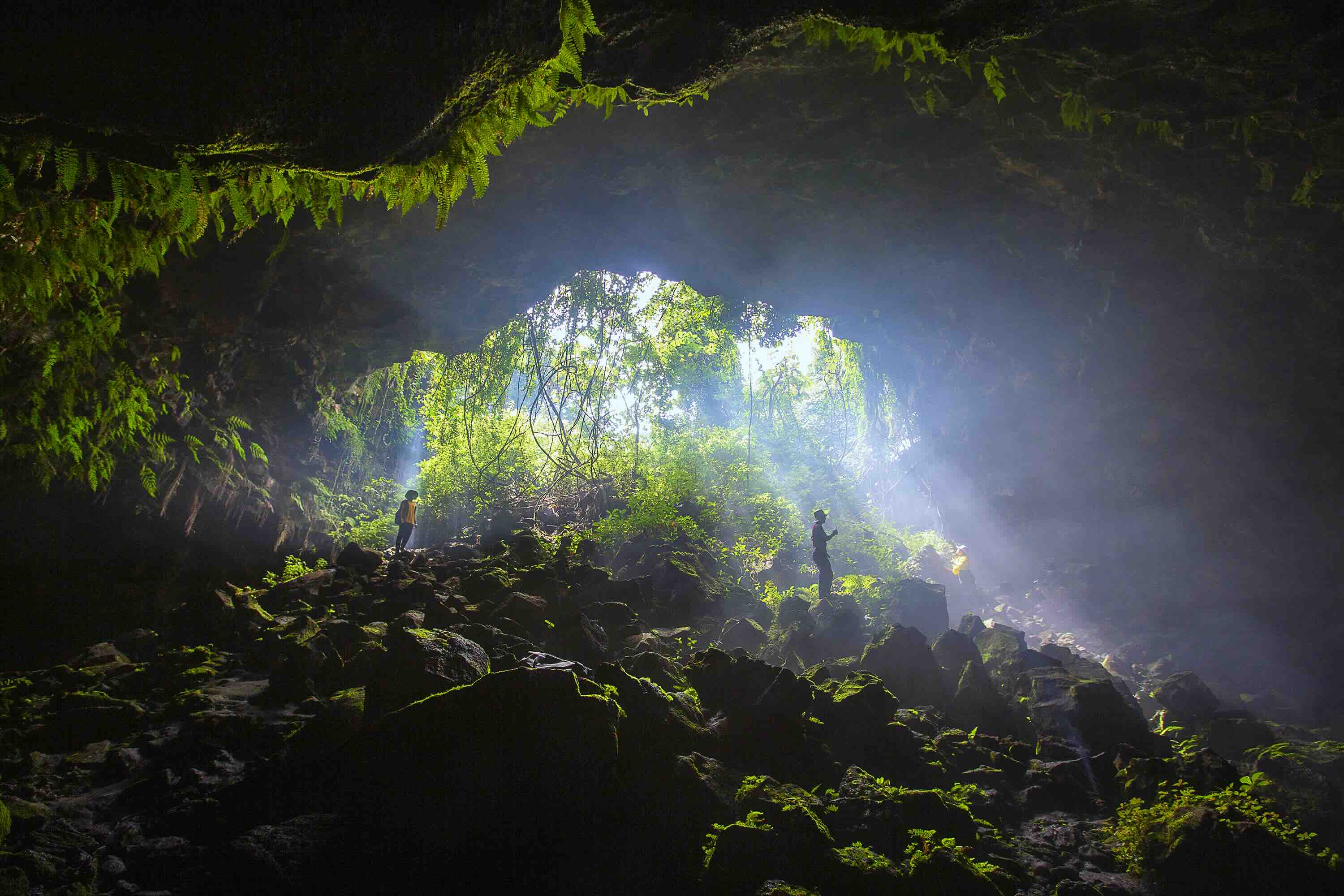 Lòng hang tối om và mát lạnh, không khí vẫn dễ thở bởi những lối thông khí tự nhiên. Khi những tia sáng le lói phía cửa hang biến mất hẳn, mọi âm thanh của thế giới bên ngoài như cũng mất theo, chỉ còn nghe thấy nhịp thở và tiếng bước chân của chính mình. Dưới ánh sáng loang loáng từ những ngọn đèn pin đội đầu, một thế giới kỳ vĩ, hoang sơ được mở ra. Vòm hang như một triển lãm điêu khắc của thiên nhiên với những nhũ đá ngắn “mọc” xuống từ trần hang, những lỗ bọt khí còn sót lại khi lớp vỏ dung nham đông cứng, có những chỗ vách đá phản chiếu ánh đèn lấp lánh như pha lê. Hai bên vách hang còn nguyên dấu vết của dòng chảy dung nham cổ xưa. Tất cả bày ra như một cuốn sách bằng đá ghi lại lịch sử phun trào của núi lửa từ hàng trăm nghìn năm trước. Chúng tôi còn tranh thủ thám hiểm một số hang ở gần đó. Mỗi hang động có một đặc điểm riêng, đều là những không gian tĩnh lặng, mát lạnh gợi cảm giác thiêng liêng như một ngôi đền tự nhiên khiến con người cảm thấy bé nhỏ và tôn kính thiên nhiên hơn bao giờ hết.