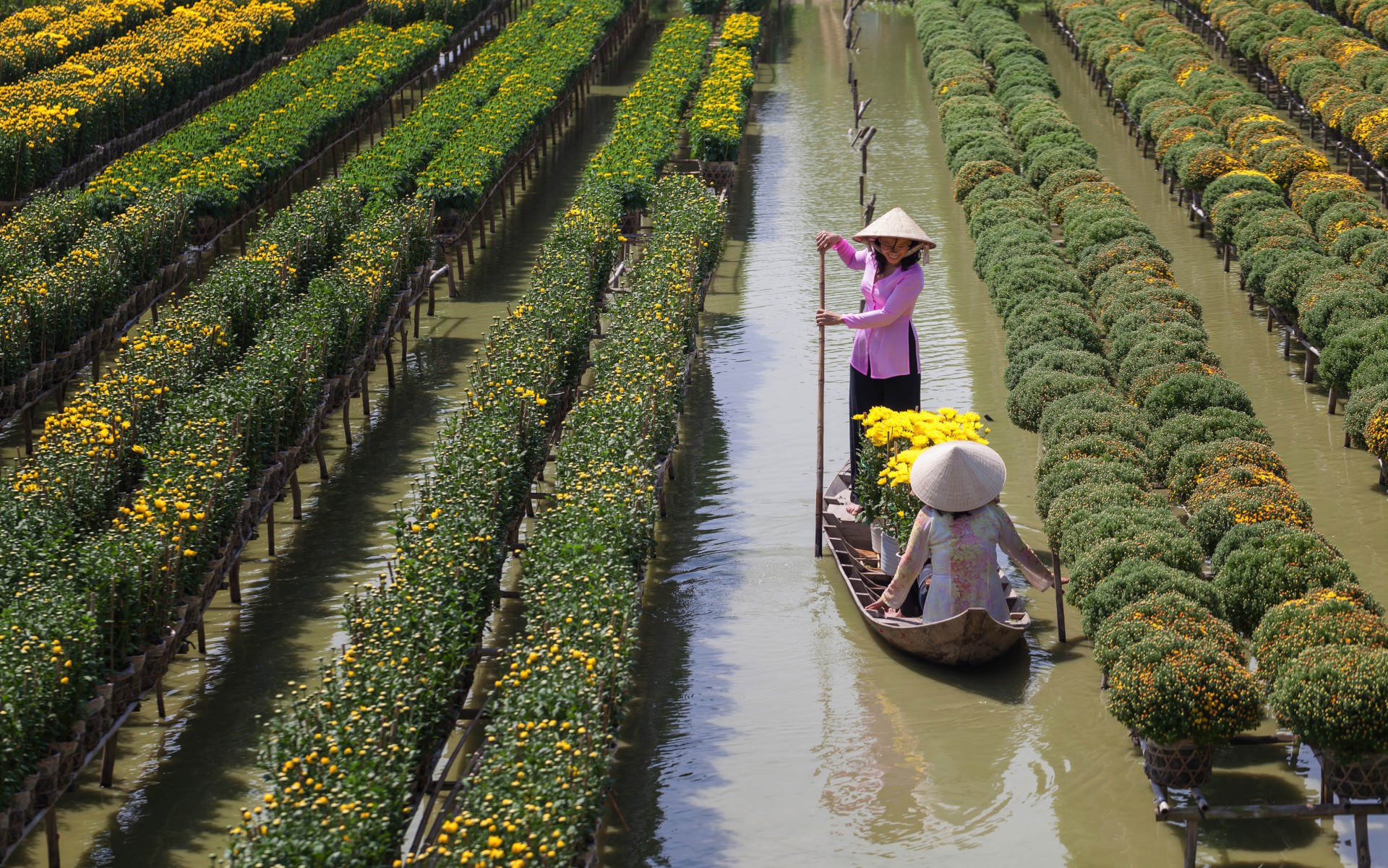 Về đồng bằng sông Cửu Long, du khách lại ngỡ ngàng với nghề trồng hoa kiểng tại các vùng Bến Tre, Sa Đéc, ở đó thiên về các loại cúc vạn thọ, hồng, hoa bướm… Đặc trưng của những làng hoa miền Nam là cánh đồng rộng, nhiều lối đi giữa vườn, rất thích hợp cho việc chụp ảnh lưu niệm, ảnh cưới. Bản chất người miền Tây hồn hậu, phóng khoáng, do đó vào dịp cuối năm rất đông bạn trẻ từ các nơi tìm về đây ngắm hoa. Cũng có thể về chơi để mua cho gia đình những chậu mai cảnh ưng ý, bởi nếu miền Bắc đón xuân không thể thiếu hoa đào thì trong miền Nam, mai vàng là loài hoa mang lại hạnh phúc, tài lộc, may mắn. Nói về mai cũng không thể bỏ qua làng nghề Háo Đức tại Bình Định, một làng nổi tiếng với kỹ thuật uốn cành, tỉa lá để cống hiến cho xã hội những chậu mai tuyệt đẹp. Cách chơi hoa mỗi miền một khác, song với cây mai thế cũng không khác nhiều với đào thế miền Bắc, người chơi chuộng những dáng cây mang ý nghĩa như Phụ Tử, Huynh đệ đồng khoa, Ngũ Phúc… hay các dáng Trực, Bạt phong, Hồi đầu… Có dịp tới làng mai Háo Đức, ngồi dưới mái nhà của nghệ nhân cây cảnh ngắm những bông hoa vàng rực rỡ dưới nắng miền Trung, nhìn công sức con người phải bỏ ra để có được một dáng cây đẹp, lúc đó ta mới thực sự hiểu giá trị của những chậu cây cảnh nở hoa vào đúng ngày xuân.