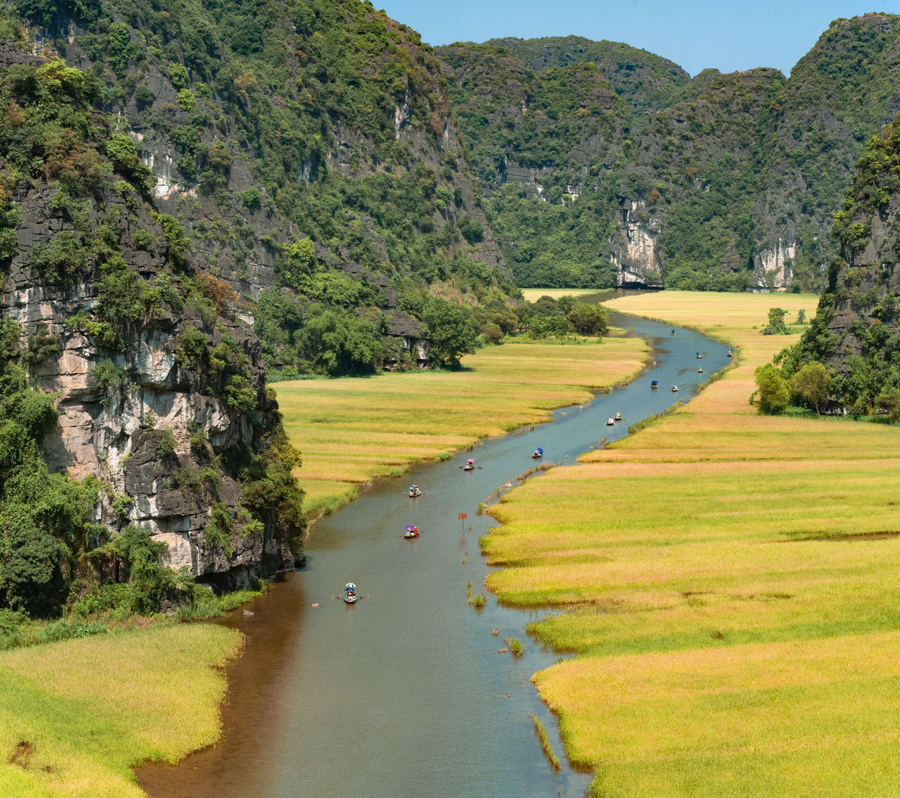 Tam Cốc được biết đến với cái tên nổi tiếng như “Vịnh Hạ Long trên cạn” hay “Nam thiên đệ nhị động”. Tam Cốc có nghĩa là ba hang động. Du khách thường đi thuyền xuôi theo sông Ngô Đồng để thăm các Hang Cả, Hang Hai, Hang Ba và được nghe những câu chuyện lịch sử oai hùng gắn với hệ thống hang động núi đá vôi nơi đây. Vào mùa lúa chín (khoảng tháng 5-6), những cánh đồng ngả màu vàng ruộm mang lại khung cảnh thiên nhiên tuyệt đẹp cho khu vực này.