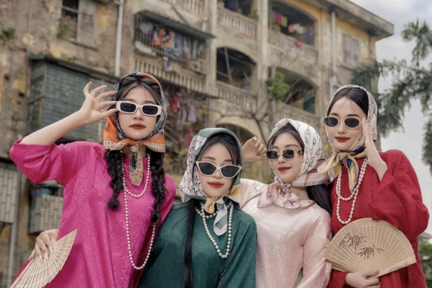Kính râm đang trở thành phụ kiện quen thuộc trong các bộ ảnh áo dài Tết. Những mẫu kính mắt mèo hoặc kính gọng oval nhỏ tạo sự tương phản thú vị giữa trang phục truyền thống và phụ kiện hiện đại, giúp tổng thể trông thời trang hơn.