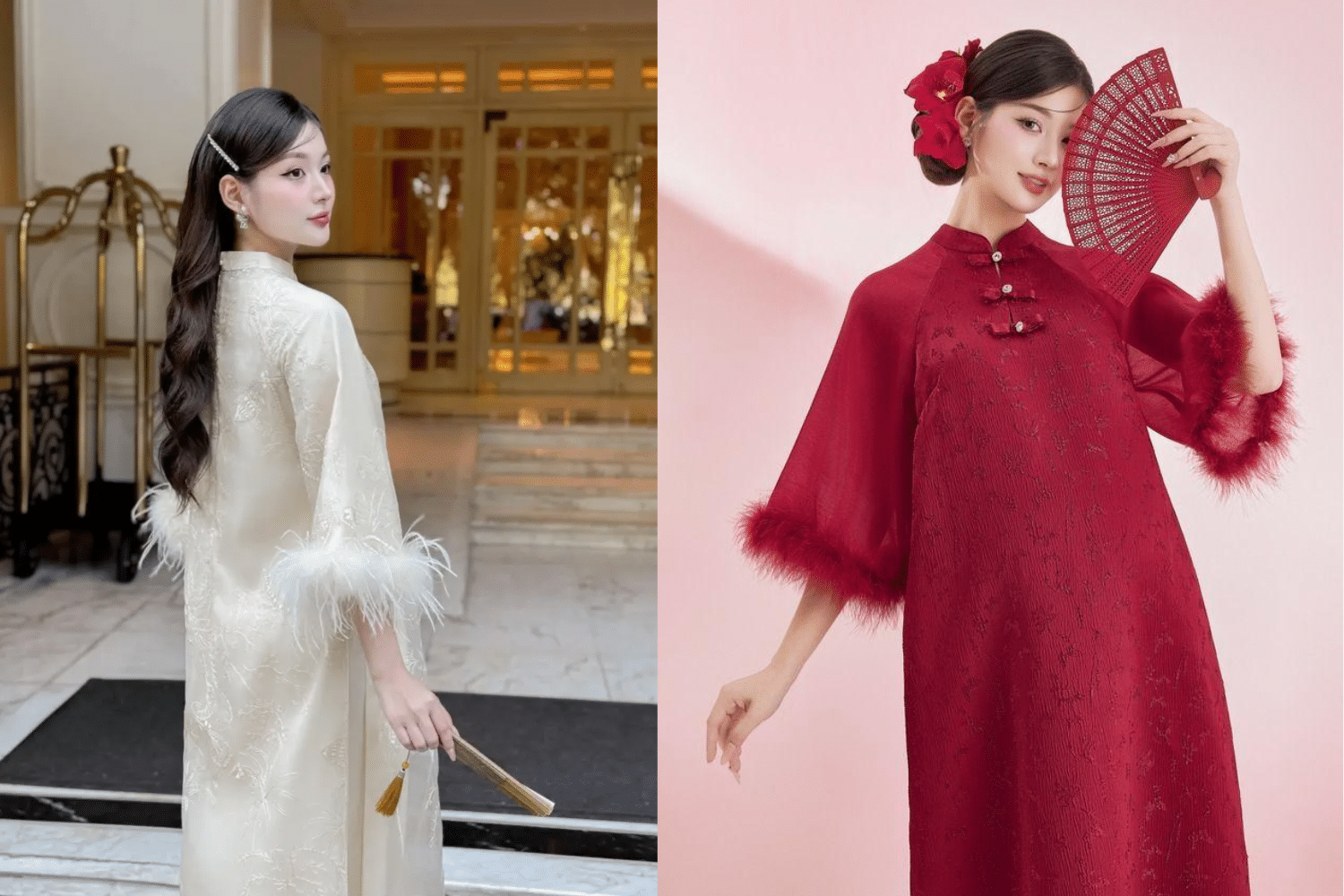 Năm 2025, lông vũ trở thành một trong những điểm nhấn đặc biệt trong các mẫu áo dài. Những chi tiết lông vũ mềm mại, thanh thoát được đính kết tinh tế trên phần tay áo, mang đến một vẻ đẹp quyến rũ, thanh cao, phù hợp trong những dịp lễ trọng đại.
