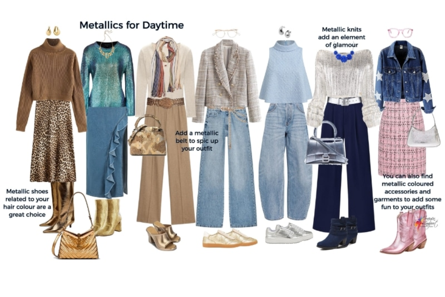 Để mặc kim loại ban ngày mà không bị “lố”, bí quyết nằm ở sự cân bằng. Ánh bạc nên đi cùng những item basic – áo thun trắng, blazer đen, quần denim trơn. Một chiếc túi ánh kim phối với áo sơ mi trắng và chân váy xếp ly, hay một đôi giày sneaker bạc đi cùng quần tây dáng suông – đó chính là cách để bạn vừa nổi bật, vừa tinh tế.