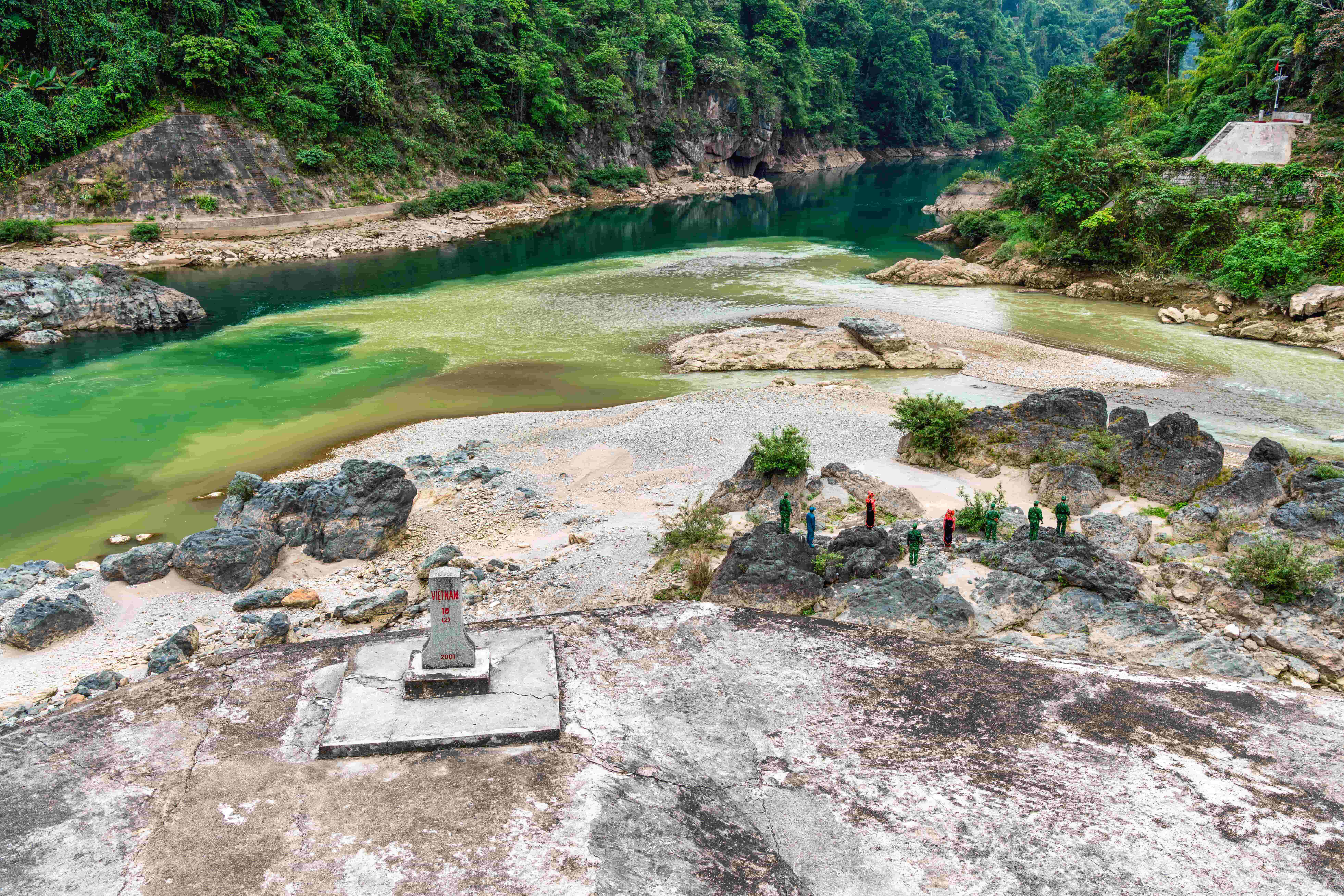 Đến trung tâm xã Mường Tè, tưởng chừng cuộc hành trình ngược dòng sông đã đến đích, ấy thế nhưng để đến được nơi đầu nguồn sông Đà ở xã Thu Lũm, chúng tôi vẫn cần vượt qua một chặng đường gần 100km nữa. Điểm giao nhau ở ngã ba sông cũng chính là điểm đầu tiên mà con sông Đà tráng lệ gieo mình vào đất Việt. Cả vùng đất, vùng trời thiêng liêng hiện ra trước mắt. Đây cũng là khu vực có ý nghĩa đặc biệt quan trọng về mặt an ninh – quốc phòng nên các chiến sĩ ở trạm kiểm soát, đồn biên phòng canh gác ngày đêm không một phút lơ là. Đồn biên phòng Ka Lăng quản lý gần 30km đường biên giới với 4 mốc giới là 18(2), 34, 35, 36. Riêng cột mốc số 18 được chia thành 3 vị trí khác nhau. Mốc 18(1) nằm trên bờ sông phía Trung Quốc, đúng tại nơi dòng sông Đà và Nậm Là gặp nhau. Mốc 18(2) thuộc quản lý của Trạm Kiểm soát Biên phòng Kẻng Mỏ, còn mốc 18(3) do Đồn Biên phòng Mù Cả phụ trách. Tại vị trí mốc 18(2), bên này là xã Mù Cả – nơi sông Đà lặng lẽ chảy qua, bên kia là sông Nậm Là đổ về từ phía Trung Quốc. Hai dòng nước – một trong, một đục hòa quyện tại điểm hợp lưu này, tạo thành đường phân thủy tự nhiên, đồng thời đánh dấu nơi sông Đà chính thức bước vào lãnh thổ Việt Nam.