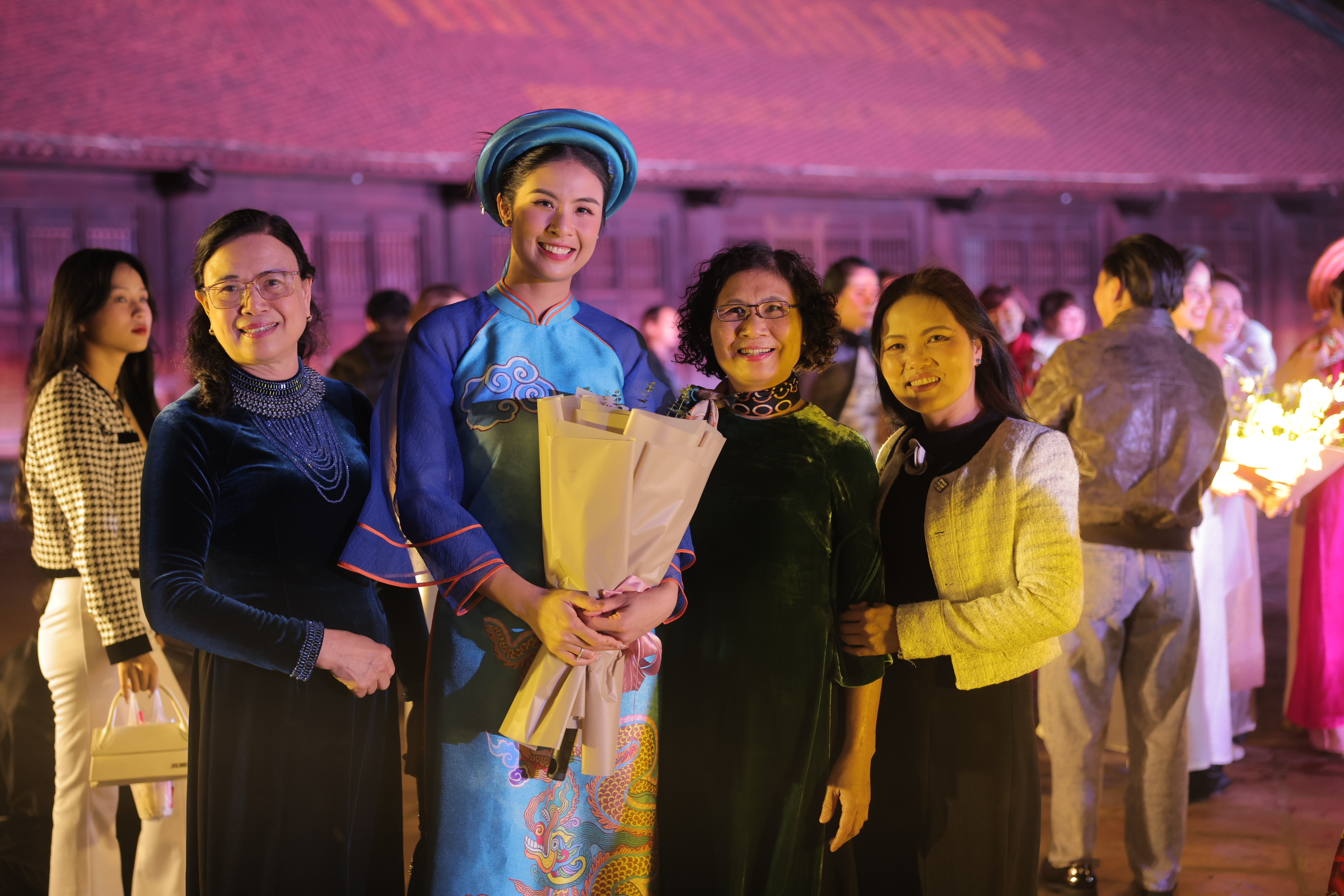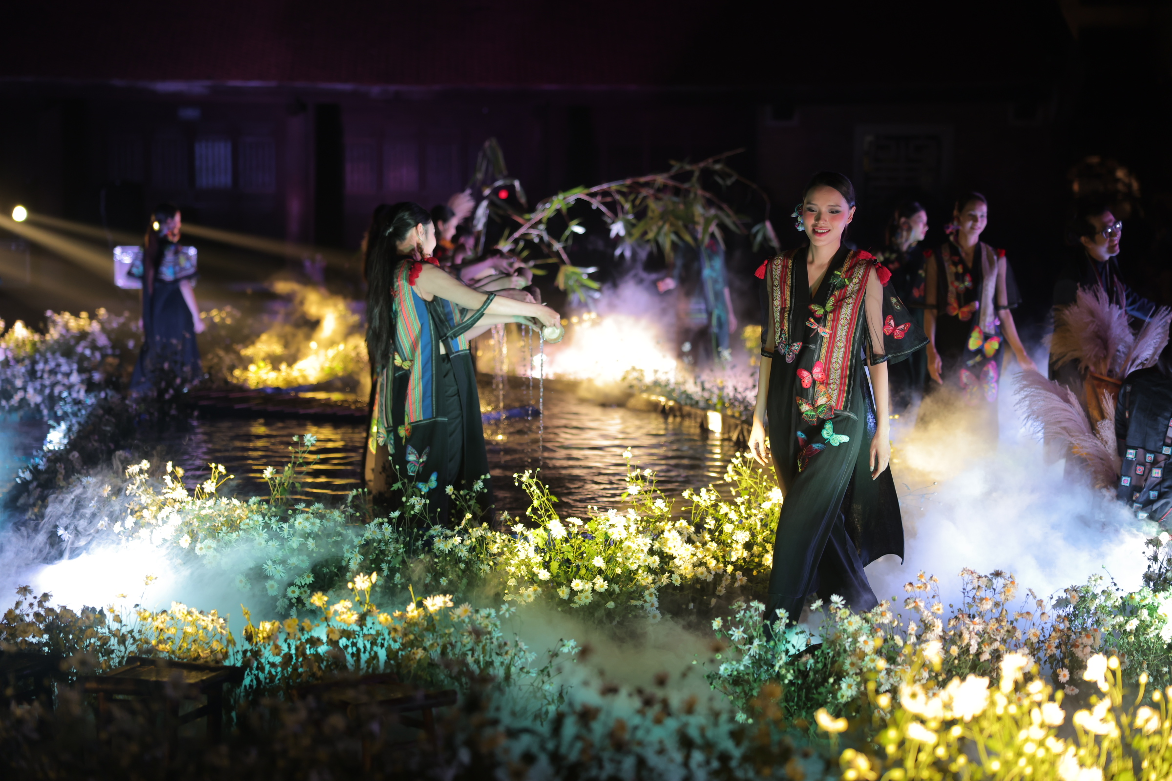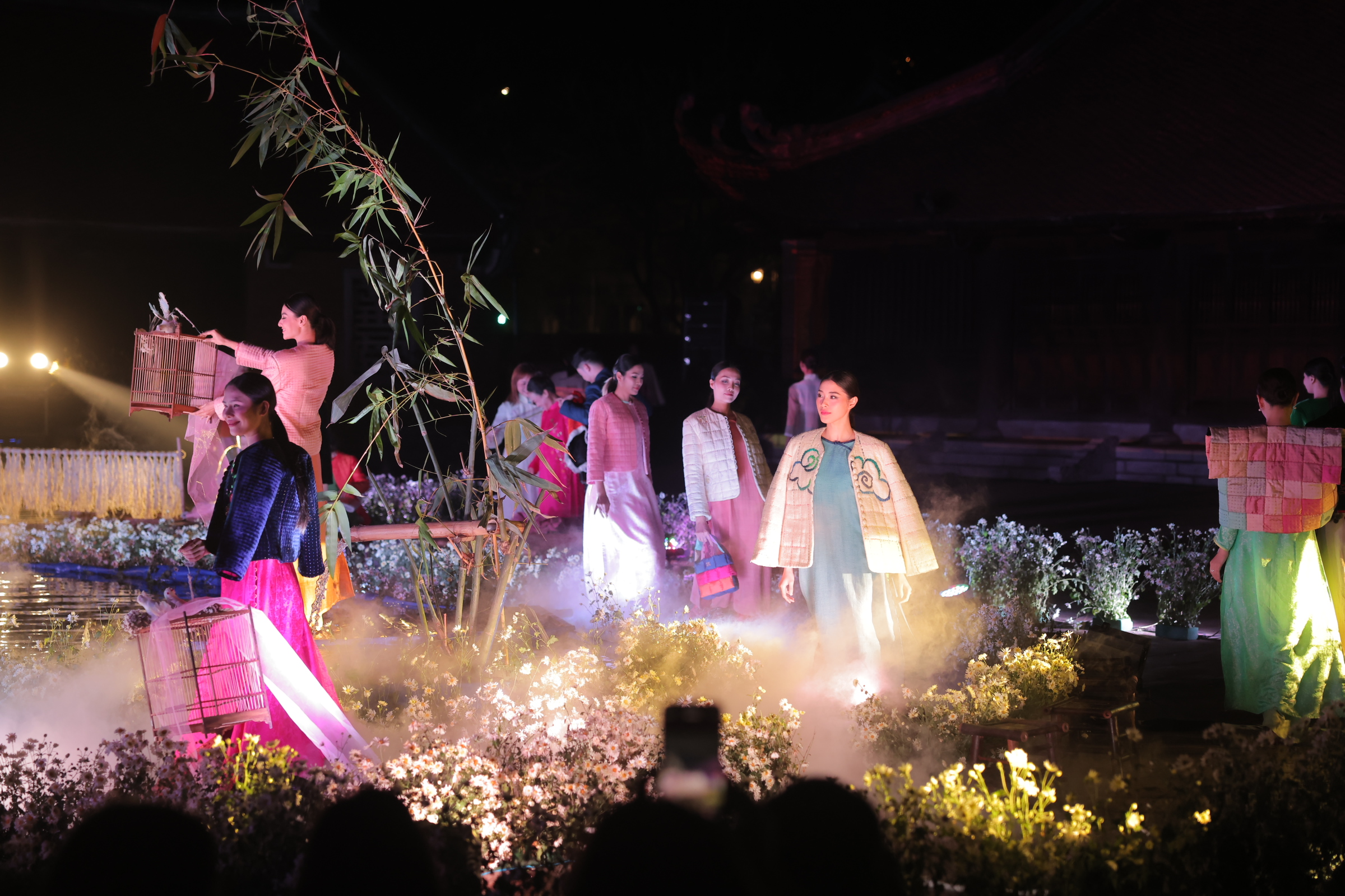 Bước vào không gian trình diễn, người tham dự sẽ ngỡ ngàng bởi giữa khu Thái Học cổ kính của Văn Miếu – Quốc Tử Giám lại xuất hiện một khung cảnh đầy thơ mộng với vườn hoa đua sắc bên dòng suối róc rách, khóm trúc la đà và bộ bàn ghế tre mộc mạc. Kết hợp cùng nghệ thuật trình chiếu ánh sáng 3D giữa màn đêm huyền ảo, lớp sương mờ như một giấc mộng đời thực, những tà áo dài hiện lên đẹp rung động lòng người. Ngoài yếu tố thị giác, show diễn còn tài tình dẫn dắt cảm xúc người xem bởi âm nhạc tuyệt vời đến từ tiếng đàn ca sáo nhị, giọng hát trong trẻo của nhiều nghệ sĩ khác nhau, khiến mỗi bộ sưu tập (BST) đều trở nên vô cùng sống động và đặc sắc.