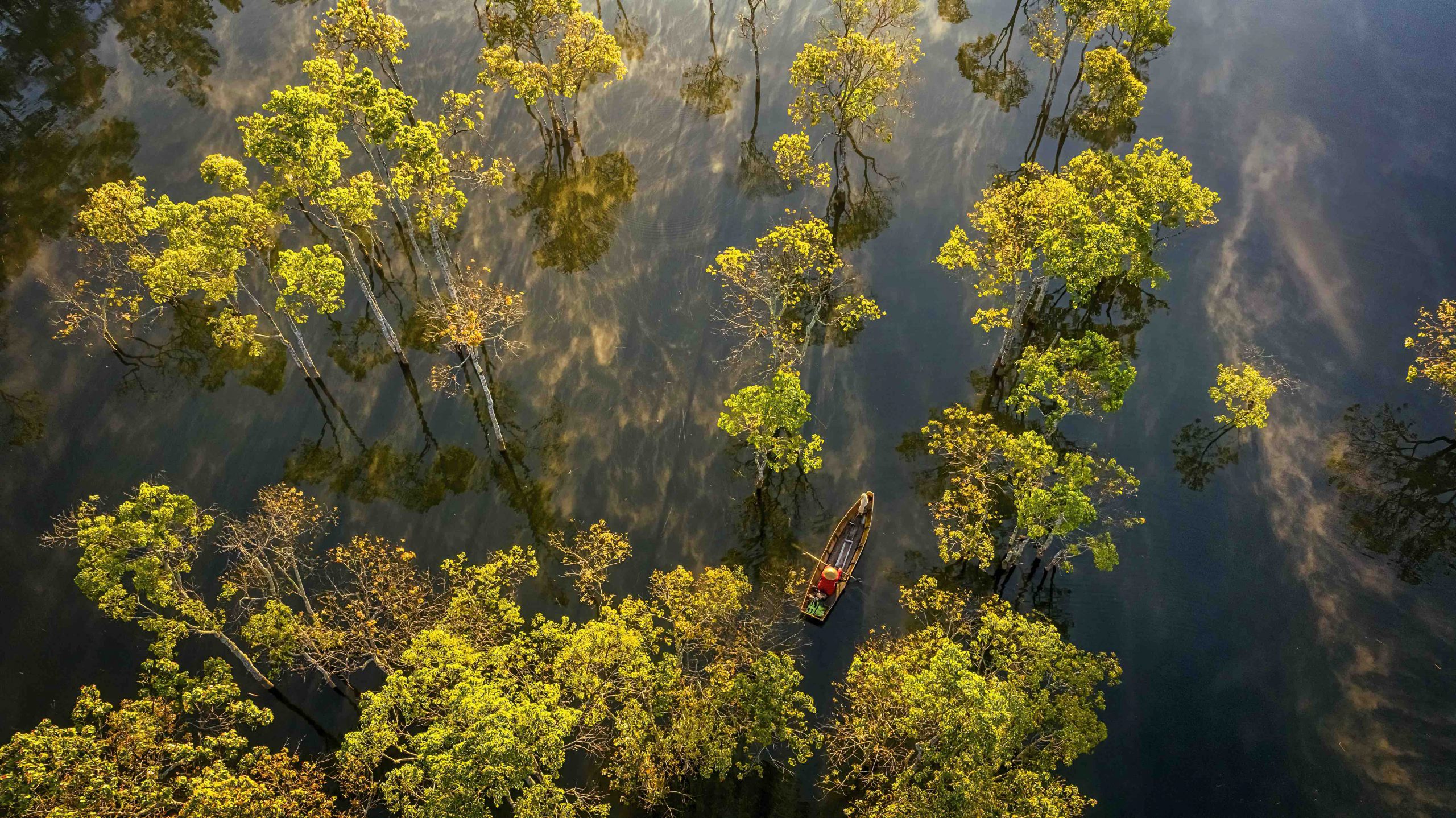 Bình minh dần nhú sau sườn núi, khu rừng chò lập tức “hút” lấy những tia nắng ban mai, các thân cây khẳng khiu trở nên nổi bật giữa khói sương bảng lảng trên mặt hồ, như những vũ công đang say sưa trong vũ điệu thần tiên. Bất chợt, giữa không gian huyền ảo tĩnh lặng ấy, tiếng mái chèo khua nước vang lên khoan thai, chậm rãi. Con thuyền đánh cá bằng gỗ nhỏ nhắn của lão ngư phủ duy nhất ở Suối Tía dần hiện ra giữa màn sương như đến từ cõi hư vô, càng khiến khung cảnh vốn đã đẹp, lại thêm phần liêu trai.