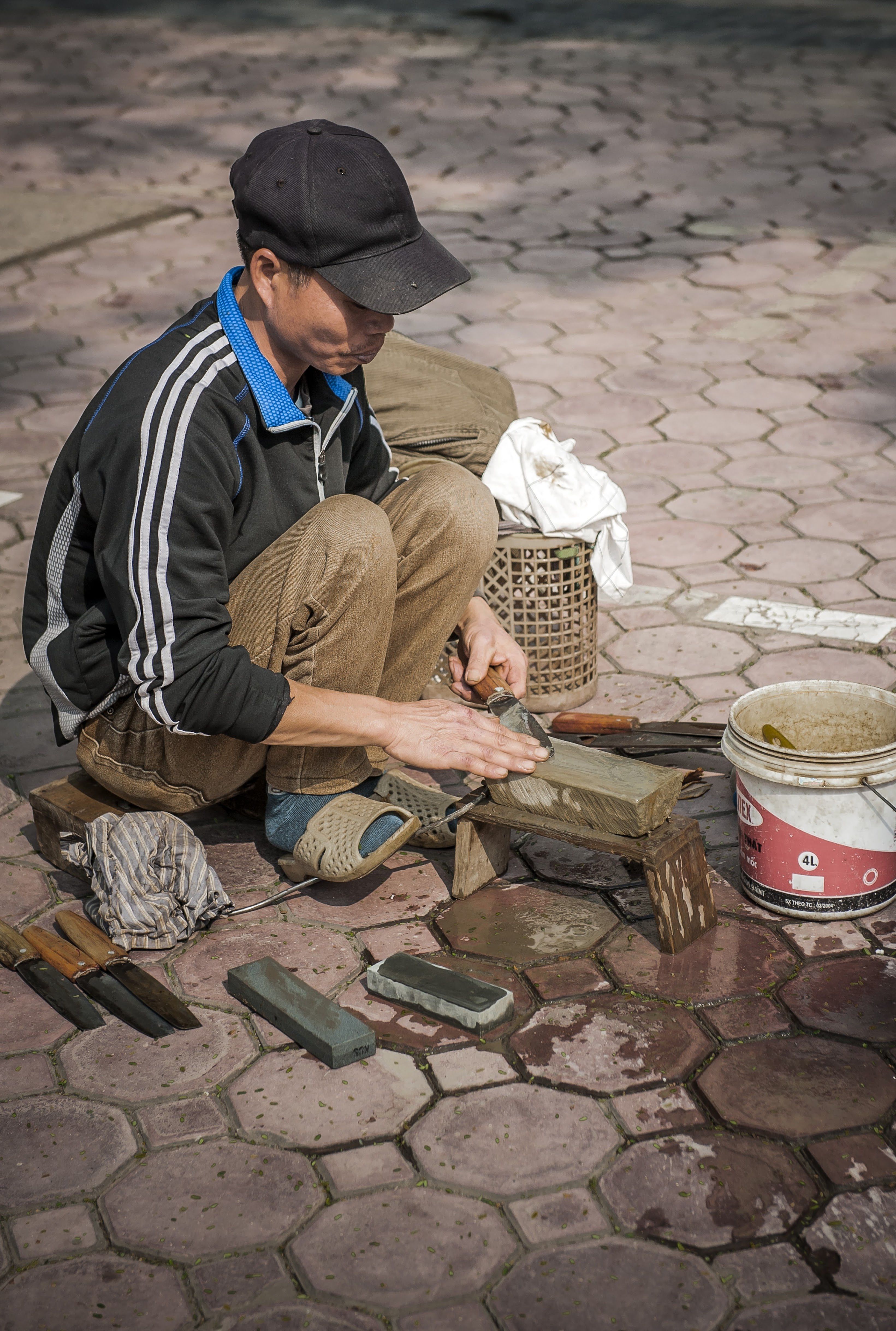 1. Chúng tôi ngồi bên nhau dưới những tàng cây thấp nơi góc phố Lý Thường Kiệt lưa thưa nắng. Từng ngày ấm tan dần theo sự chảy trôi của mùa, nên có chút nắng hiếm hoi là phải ra phố hong cho khô ảm đạm. Không phải lời rao trầm đều mà chính là tiếng quay kin kít từ vòng bánh xe mòn rạt của bác thợ mài dao đã kéo chúng tôi ra khỏi sự buồn tẻ. Thứ âm thanh vô tư ấy khiến con phố trở nên tươi tỉnh hơn giữa cái lạnh ngày đông. Nghe có tiếng gọi với từ một quán cơm nhỏ, bác thợ chao nhẹ ghi-đông và nhấc gọn chiếc xe lên vỉa hè. Bác vui vẻ nhận dao từ tay người phụ nữ trung niên rồi gỡ chiếc làn cũ phía sau yên xe xuống. Đồ nghề đơn giản chỉ có vài viên đá mài hình chữ nhật màu ghi xám, chổi sơn, chai đựng cát, khăn cũ, xô nước nhỏ cùng chiếc ghế gỗ đã nẻ đầy những nếp nhăn. Trước khi mài, bác kiểm tra tình trạng dao bằng đường miết tay rất mịn với cái nhìn chăm chú của một mắt thợ lành nghề. Lưng cong xuống, đầu gối ép sát ngực, mắt hồ như không chớp, con dao sau những đường lướt tay nhanh nhẹn đến khi lưỡi dao mỏng sáng lên, bác mới chịu dừng.