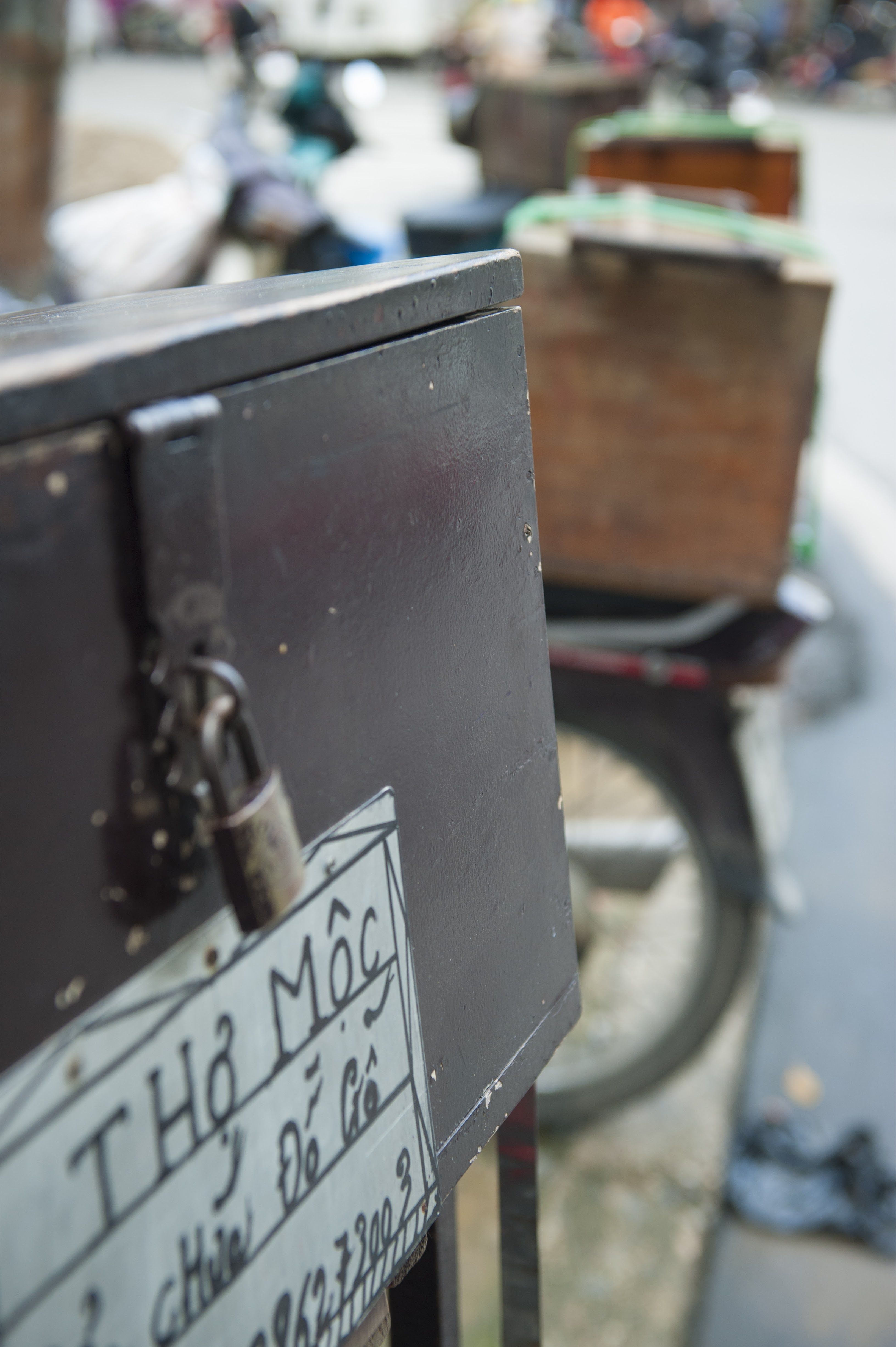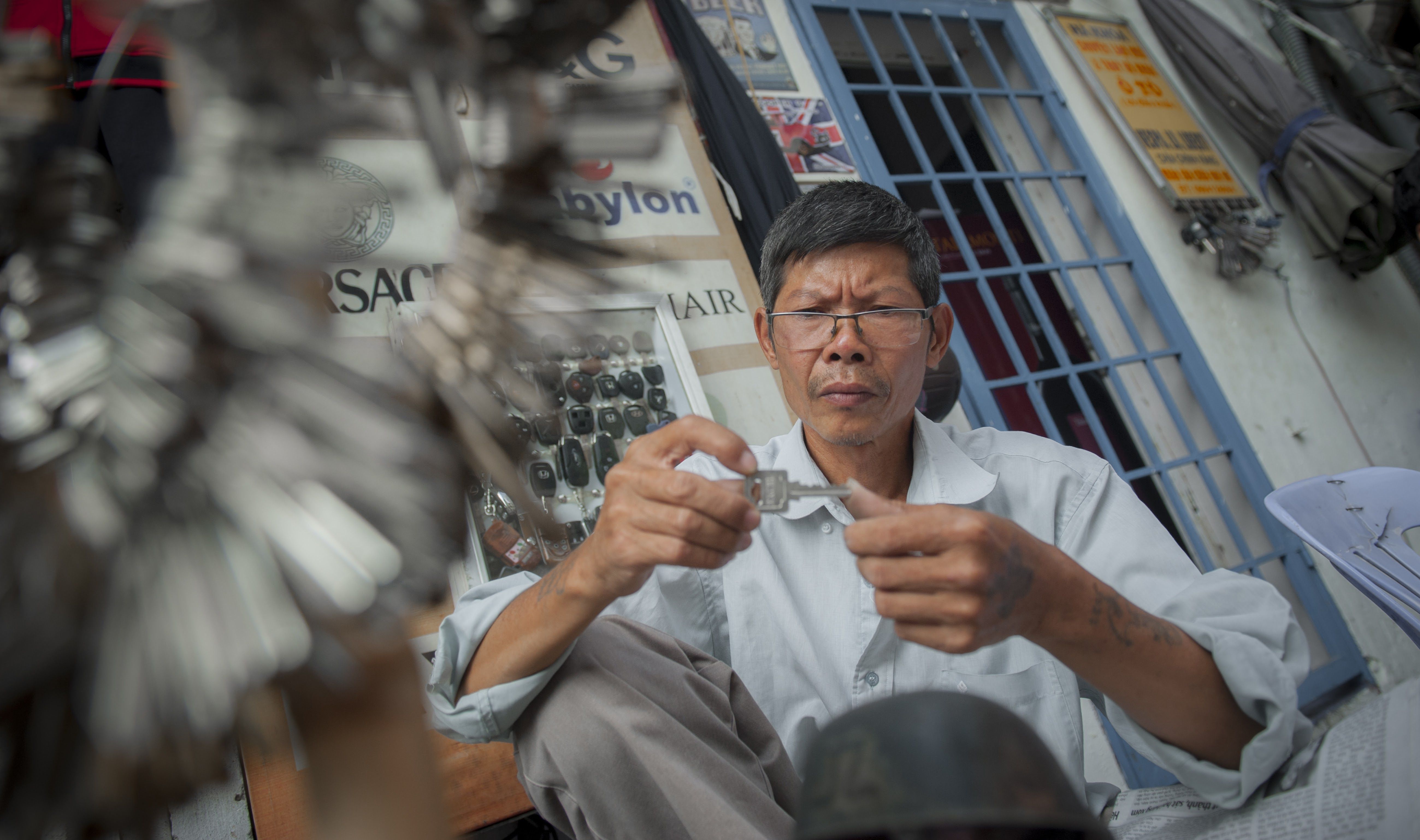 3. Lương Văn Can, một chiều ồn ã như bao chiều. Bác thợ khóa già tỉ mẩn mài từng chiếc khóa nhỏ. Tiếng rì rì của máy mài, tiếng sàn sạt của ngọn chìa miết trên đá cùng khói sắt và những tia nước ấm lẫn vào những náo nức còi xe. Ngón tay nắn nót, ánh nhìn thật sâu, để mỗi khía răng cưa lượn vào nhô ra của chìa phải chuẩn từng micromet. Chăm chú mài chìa tra khóa, chiếc kính lão cứ chễ xuống mũi để lộ nếp hằn sâu giữa hai chân mày bác thợ. Những vòng khóa treo trên chiếc cột tre kết vòng đều đặn, xòe ra như những bông hoa. Thật hơn, nó như chiếc vòng của cô gái vùng cao xuống hội đang tỏa ra trăm nhánh bạc đầy kiêu hãnh. Bác thợ khóa từng nói, với công việc này, kỹ năng chỉ là một phần, cần hơn là cái tâm trong nghề và sự nhạy bén để phân biệt được đâu là khách thật, đâu là kẻ xấu. Nên giữa lúc làm khóa, bác rất chịu khó trò chuyện với khách, một trong những cách khá tốt giúp bác suy xét. Lọt giữa các biển hiệu hào nhoáng hay đồ chơi rực rỡ sắc màu, góc khóa nhỏ của bác như một nét chấm phá rất riêng cho phố…