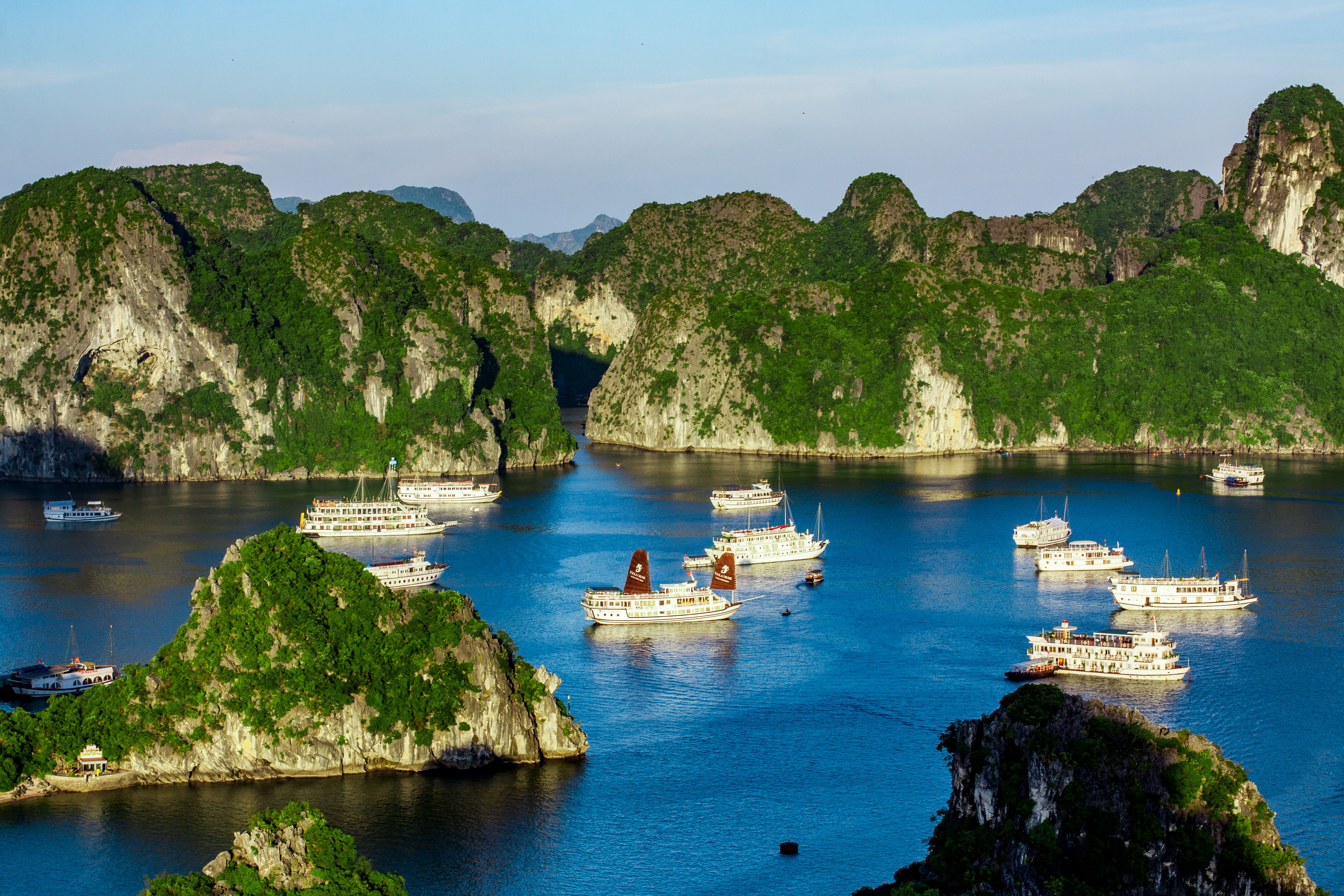 Cách Hà Nội khoảng 165km về phía đông bắc, vịnh Hạ Long nổi tiếng với gần 2.000 đảo đá đủ hình thù và kích cỡ nổi trên mặt biển tĩnh lặng. Từ trên cao nhìn xuống, quang cảnh nơi đây tựa bức tranh thủy mặc khổng lồ với những nét chấm phá tài nghệ. Dưới bàn tay của tạo hóa, đảo đá vô tri hóa thành những hình hài sống động, thân thuộc với con người, như hòn tựa đôi gà trống mái, đảo giống chú rùa lim dim ngủ, nơi như đỉnh hương tế đất trời… Sâu trong đảo đá là những hang động tuyệt đẹp như động Thiên Cung, động Tam Cung, hang Sửng Sốt hay hang Trinh Nữ. Mỗi nơi lại mang dáng vẻ riêng, huyền bí và kỳ ảo.