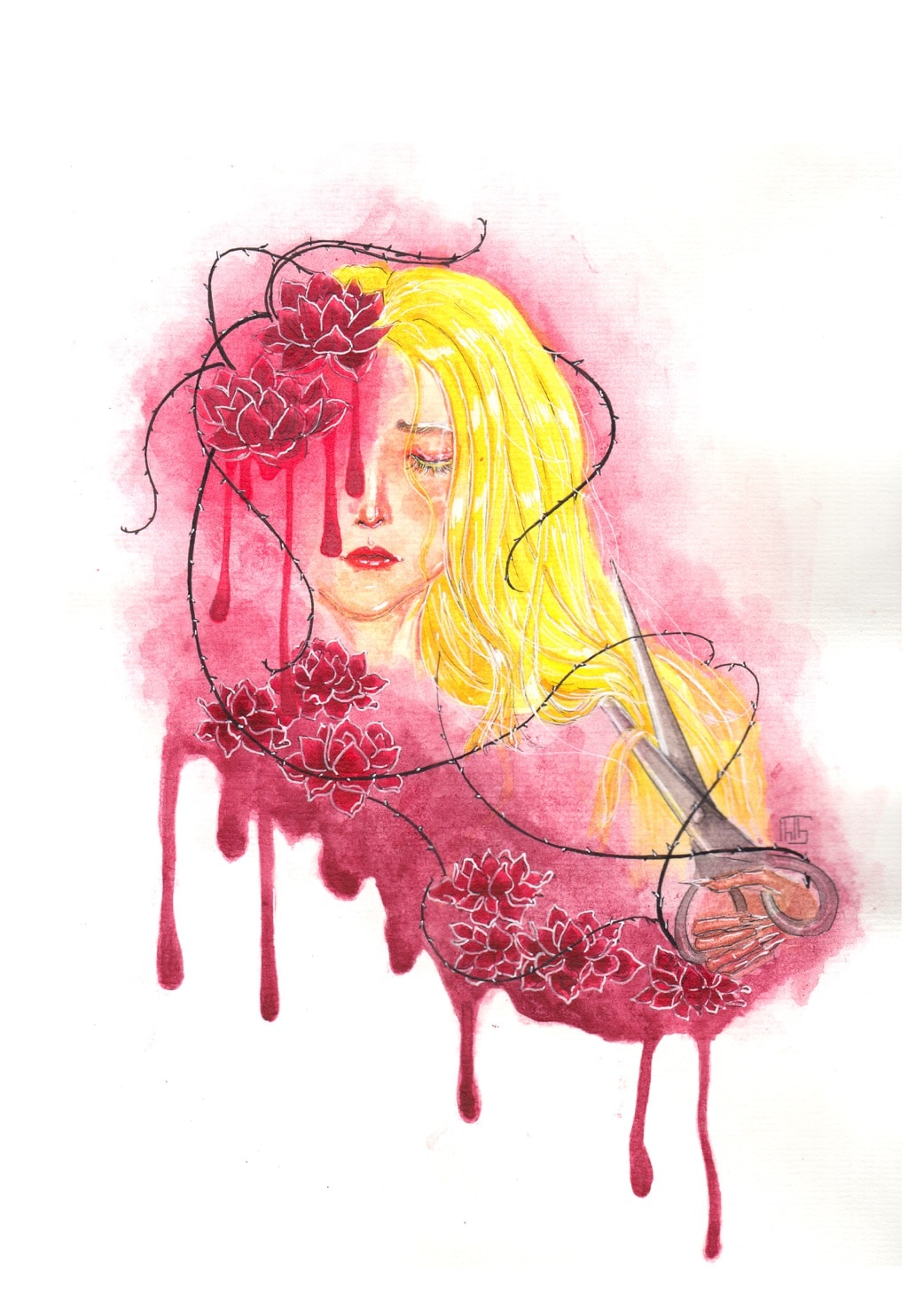 Rapunzel sở hữu mái tóc dài, đẹp như vàng ròng. Nghe thấy tiếng mụ phù thủy, cô liền gỡ tóc, buộc xung quanh một chiếc móc ở cửa sổ rồi thả tóc xuống mặt đất. Mụ phù thủy bám vào tóc cô mà leo lên.