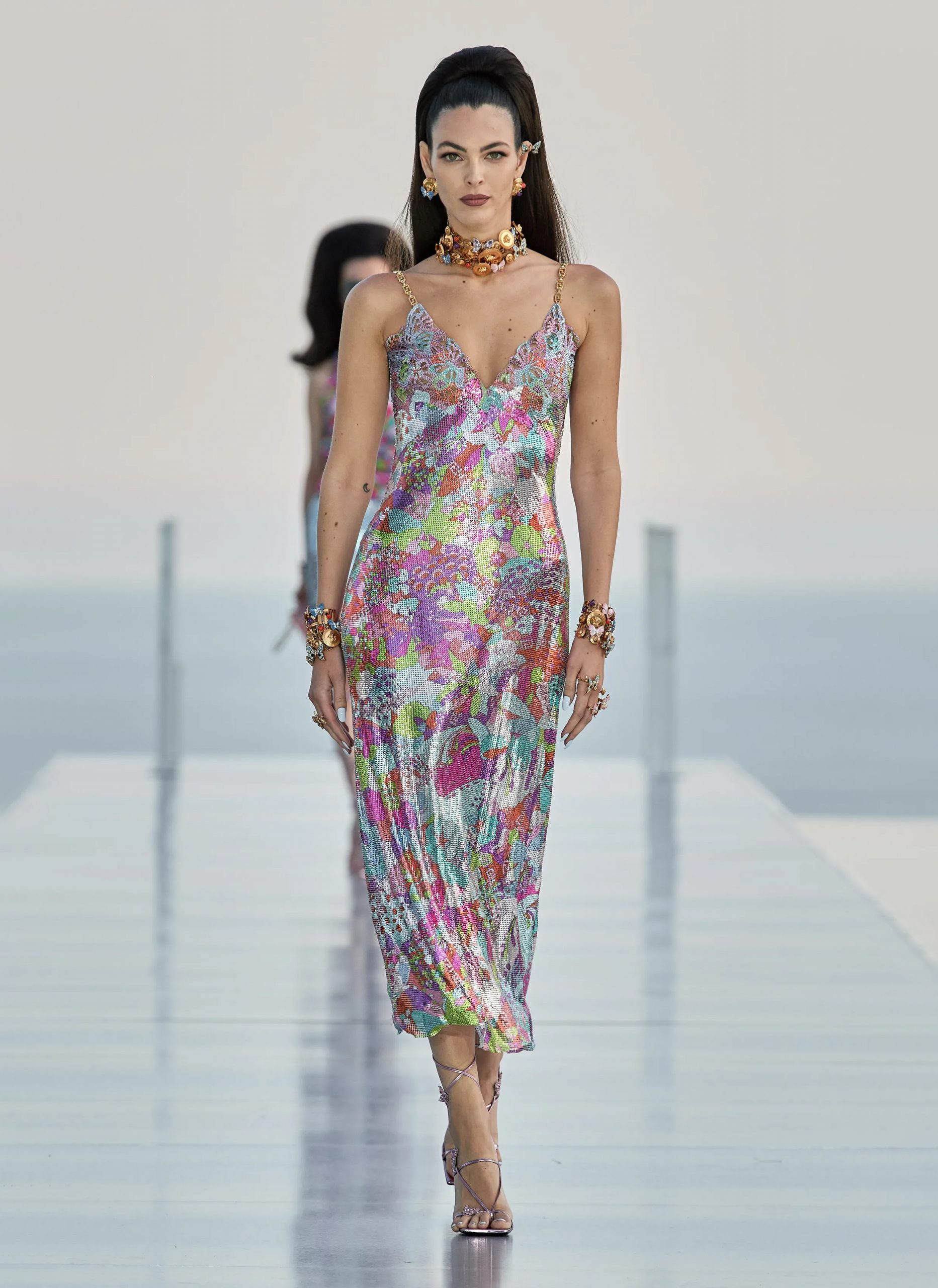 Thêm một người phụ nữ nữa không thể bỏ qua, đó là NTK Donatella Versace. Bà là người tiếp quản đế chế Versace từ những năm 90, và đến giờ vẫn duy trì phong cách dát vàng trứ danh của thương hiệu. Sự sến sẩm này là di sản sáng tạo của người anh trai vĩ đại của bà – NTK Gianni Versace. Nếu lãng mạn hóa Versace và những thương hiệu mang mô típ xa xỉ ồn ào, thì nó giống như câu người Tây hay nói: “Treo trái tim trên tay áo”. Bạn trông sến vì bạn đã để lộ ra quá nhiều.