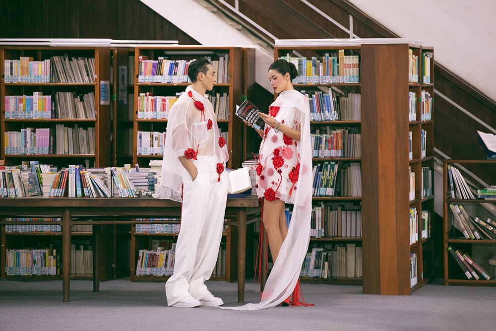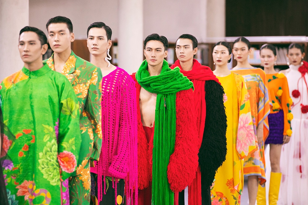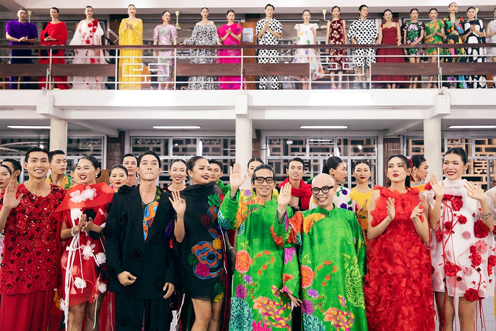 Hóa thân thành các cặp nam thanh nữ tú, dàn siêu mẫu diện thiết kế đầm ngắn cape bay bổng đính kết hoa thược dược mang lại không khí tươi vui của tuổi trẻ. Những thiết kế như scarf dress bay bổng, suit oversize, váy bubble dress bồng bềnh cùng những chiếc áo dài đính họa tiết hoa thược dược và linh vật năm Ất Tị càng góp phần tạo nên một bức tranh xuân đầy màu sắc.