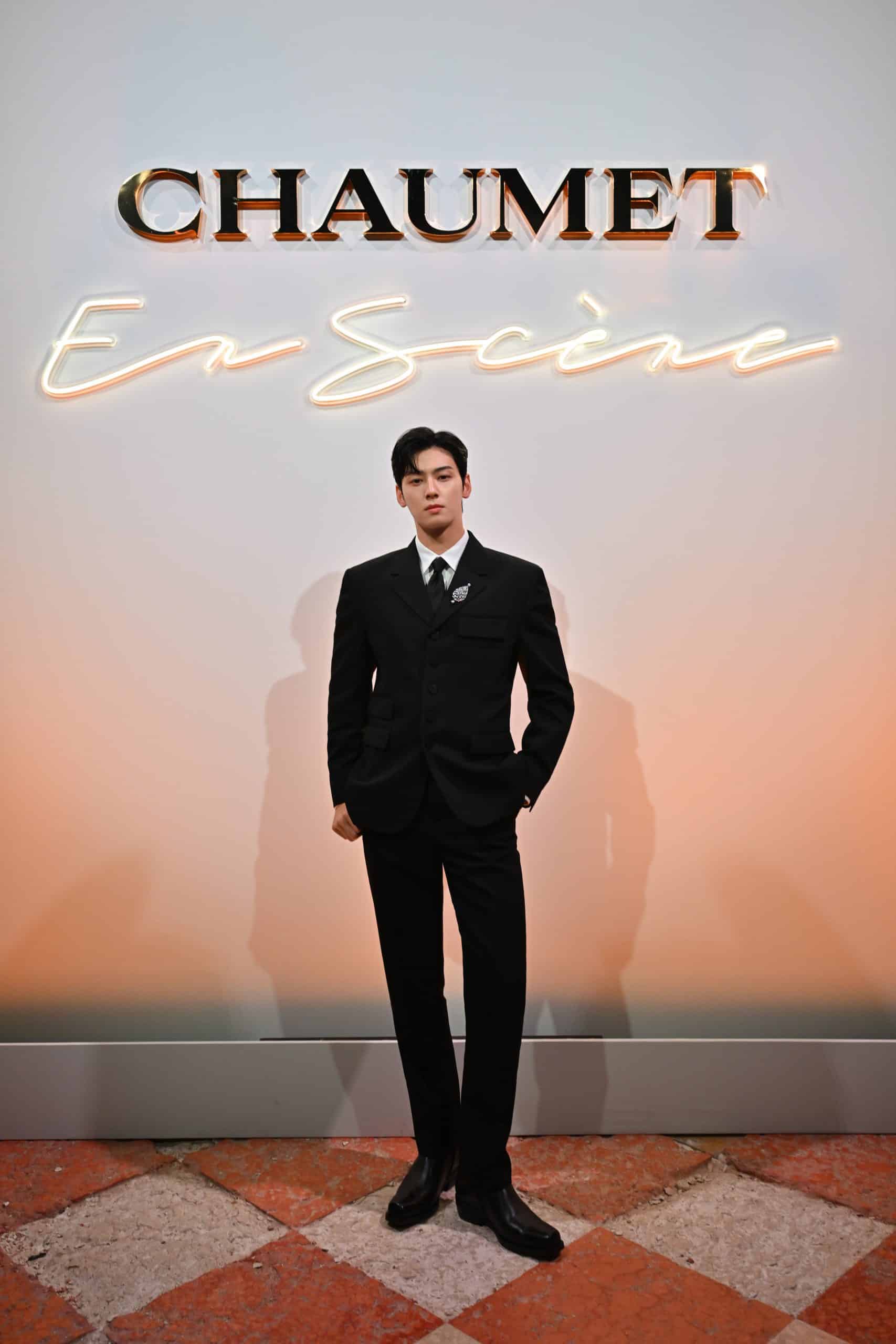 Đại sứ toàn cầu, diễn viên và ca sĩ Hàn Quốc Cha Eun Woo chọn trâm cài áo Trompe L’Œil vàng trắng đính 7,56 cara ngọc trai cúc áo màu xám, kim cương giác cắt brilliant, ngọc trai tròn mịn, và kim cương giác cắt brilliant từ BST Chaumet en Scène.
