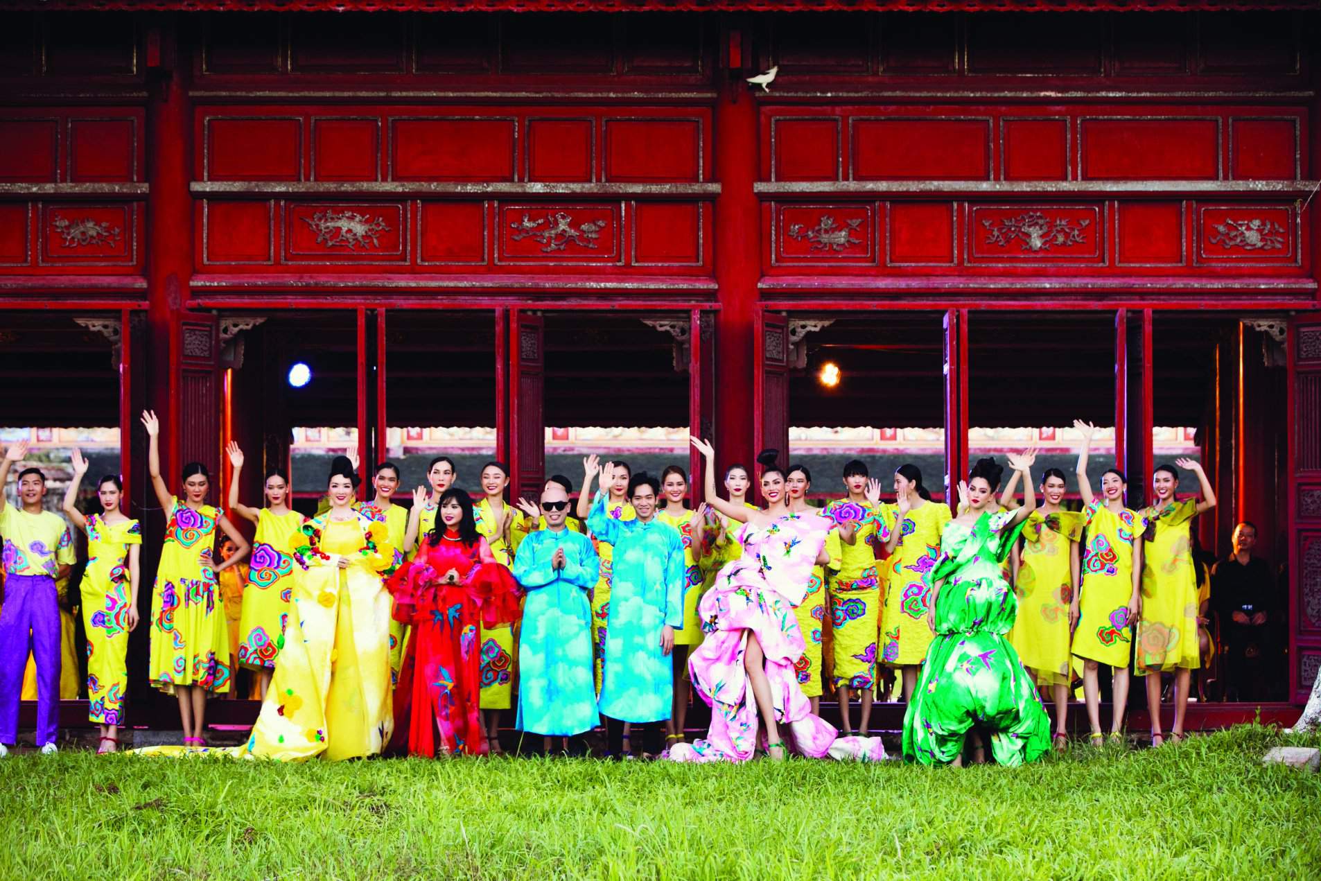 Trong không gian cổ kính của kinh thành Huế cùng âm nhạc cung đình đi vào lòng người, siêu mẫu Võ Hoàng Yến, Hoa hậu Tiểu Vy bước ra trong các bộ cánh lộng lẫy, quyền uy như những bậc hoàng tộc tái thế khiến người xem phải trầm trồ. 140 thiết kế rực rỡ được tô điểm bằng những hoạ tiết đậm nét Á Đông, sở hữu tính ẩn dụ sâu sắc như hình tượng chim én tượng trưng cho điềm lành, các áng mây ngũ sắc tượng trưng cho sự may mắn. Những chi tiết này không chỉ đẹp về giá trị thẩm mỹ mà còn chứa đựng thông điệp nhân văn mà VUNGOC&SON muốn gửi gắm về niềm tin vào một ngày mai tươi sáng hơn sau những ngày đại dịch tăm tối. Cùng các phom dáng mang phong cách đương đại như váy bodycon, váy bút chì, áo dài cách tân, đầm nơ to bản, show diễn mang tới một hơi thở hoài cổ nhưng vẫn rất hợp thời và sở hữu tính ứng dụng cao.