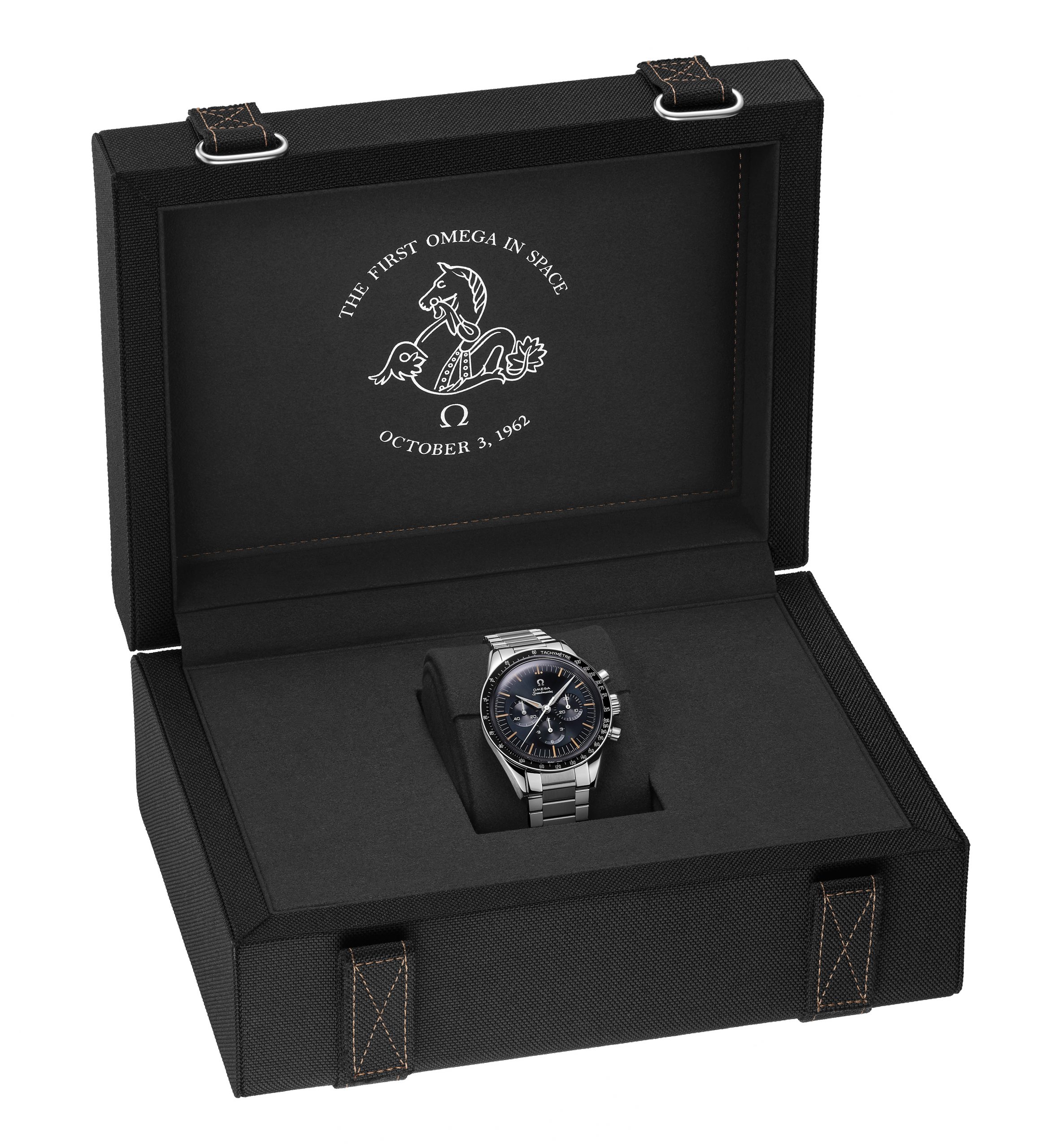 Phiên bản The First OMEGA in Space mới có ba lựa chọn với dây da màu đen, nâu hoặc dây kim loại có thiết kế mắt dây phẳng, kèm theo hệ thống nới rộng tiện lợi độc quyền của OMEGA. Đồng hồ đi kèm hộp đựng đặc biệt và những thông tin về Legendary Moon watch.