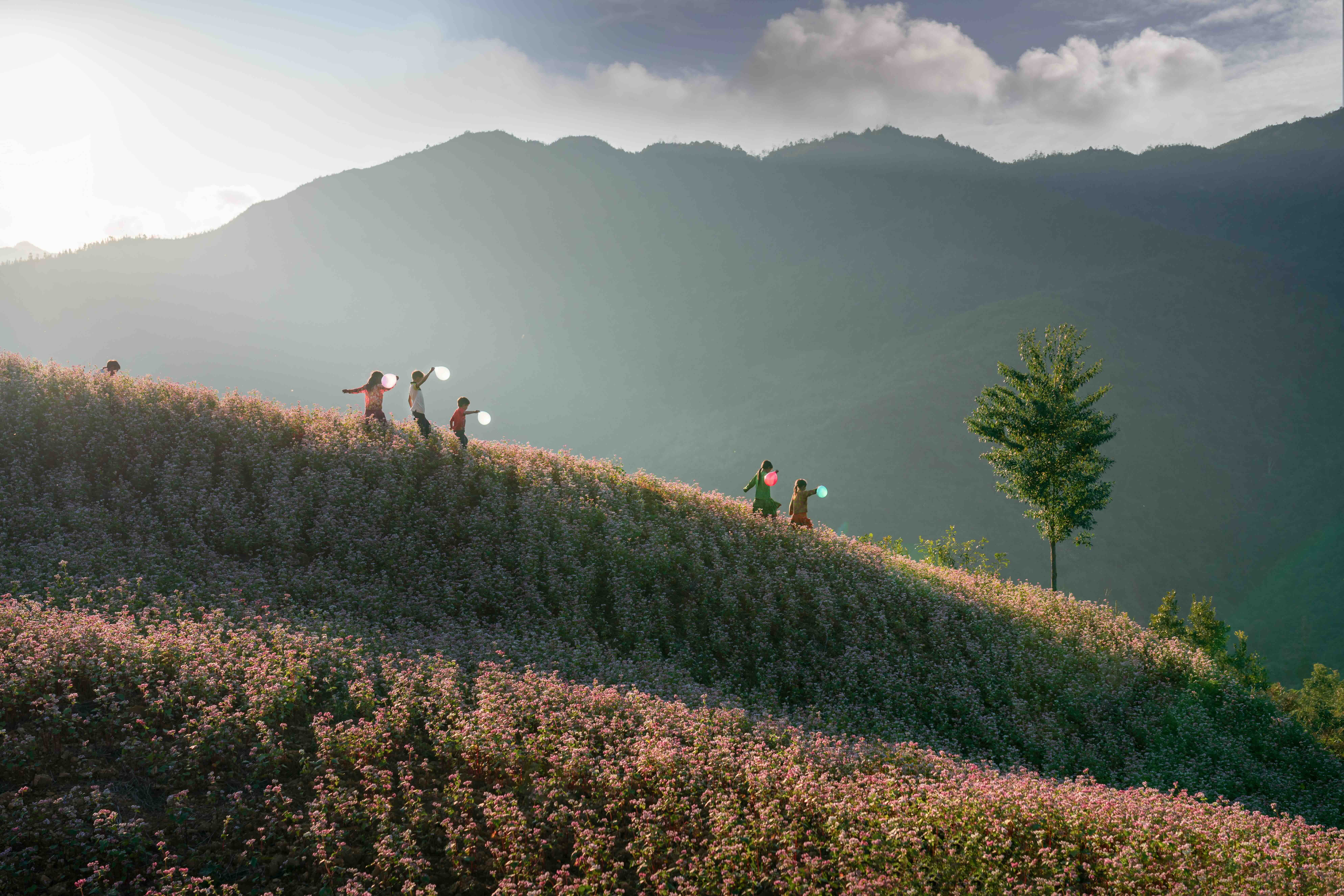 Những đứa trẻ chơi đùa bên cánh đồng hoa
