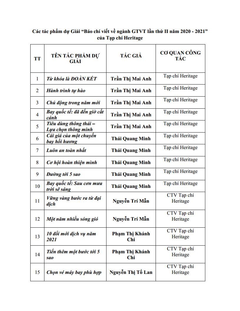 Ban tổ chức đã tuyển chọn công bố trao 23 giải cá nhân và 3 giải tập thể. Tạp chí Heritage là một trong 3 đơn vị đã vinh dự được trao giải tập thể cùng với Báo Thanh niên và Báo Bắc Giang. Đây cũng là năm thứ 2 liên tiếp Tạp chí Heritage được vinh danh tại giải báo chí lớn nhất của ngành GTVT.