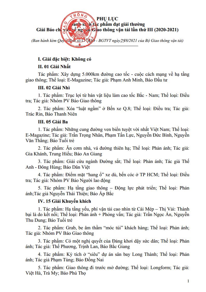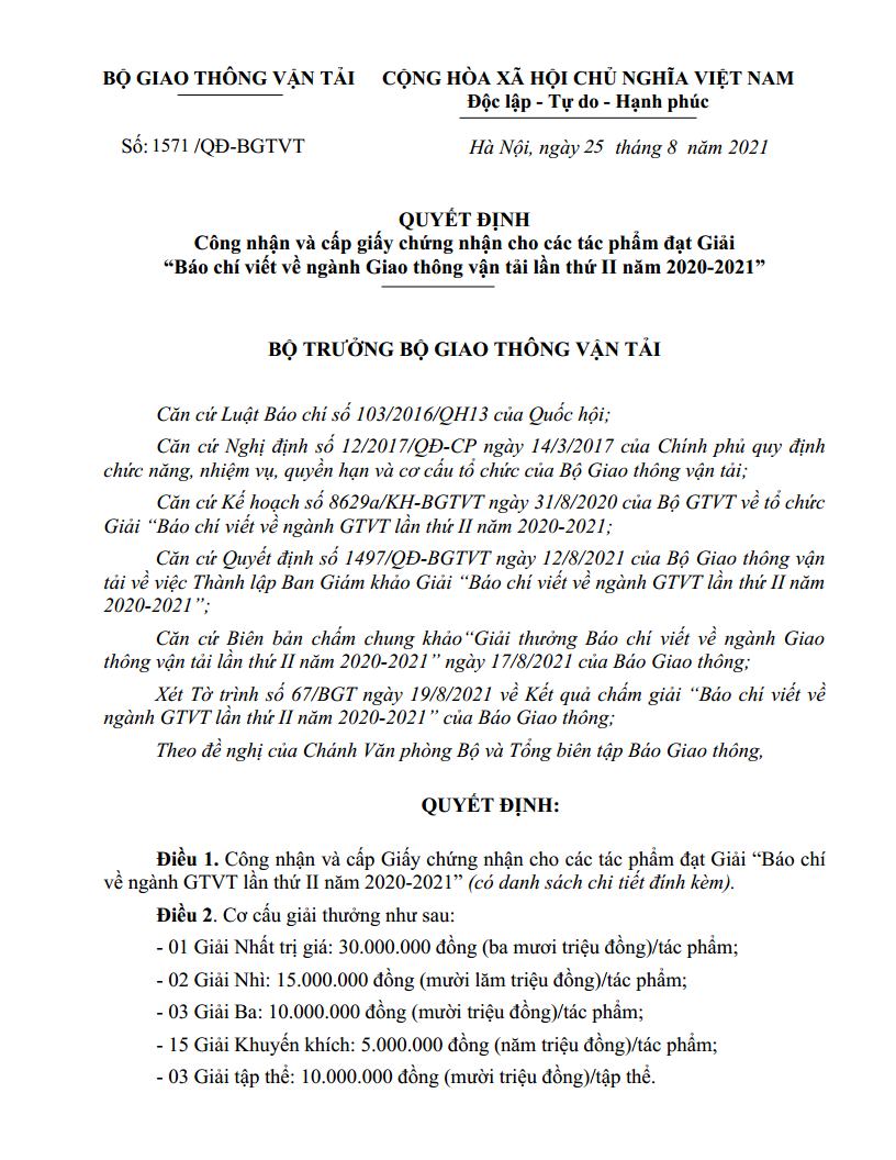 Vừa qua, Ban Tổ chức Giải thưởng “Báo chí viết về ngành GTVT lần thứ II năm 2020 – 2021” đã chính thức công bố kết quả sau 1 năm phát động cuộc thi nhân kỷ niệm 75 năm Ngày truyền thống ngành GTVT (28/8/1945 – 28/8/2020) với mong muốn phát hiện và tôn vinh những tấm gương cống hiến vì sự nghiệp phát triển, đồng thời ghi nhận những ý tưởng, sáng kiến, giải pháp đổi mới, tạo đột phá phát triển cho ngành GTVT.