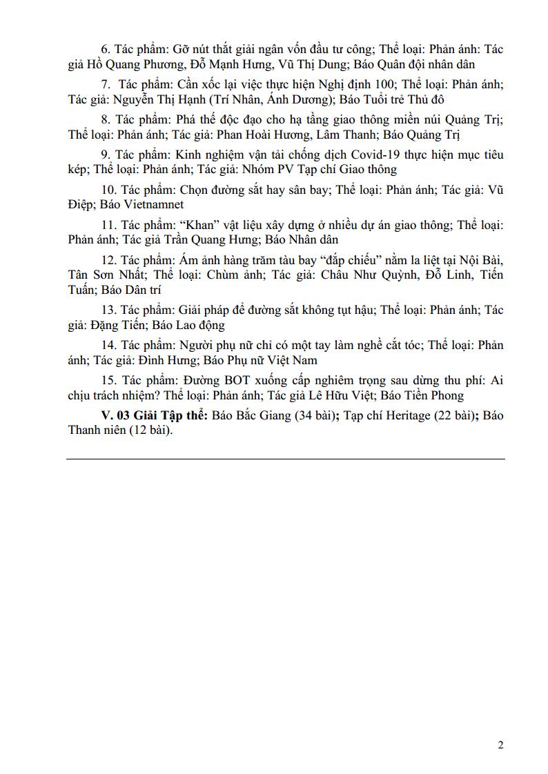 Mặc dù diễn ra trong bối cảnh cả nước tập trung chống dịch Covid-19, nhiều tỉnh, thành phải thực hiện giãn cách xã hội, nhưng Giải “Báo chí viết về ngành GTVT lần thứ II” vẫn có sức lan tỏa lớn và nhận được số lượng bài dự thi nhiều hơn lần đầu tổ chức với gần 200 tác phẩm dự thi của gần 40 cơ quan báo chí Trung ương và địa phương. Các tác phẩm dự giải đảm bảo đúng thể lệ, có chất lượng tốt, có góc nhìn tươi mới về những thành tựu của ngành GTVT; nhiều tác phẩm được trình bày công phu, hình thức thể hiện sinh động, hiện đại, hấp dẫn, lôi cuốn bạn đọc, đồng thời có những sáng kiến, đề xuất, ý tưởng mới đóng góp vào công cuộc phát triển ngành GTVT.