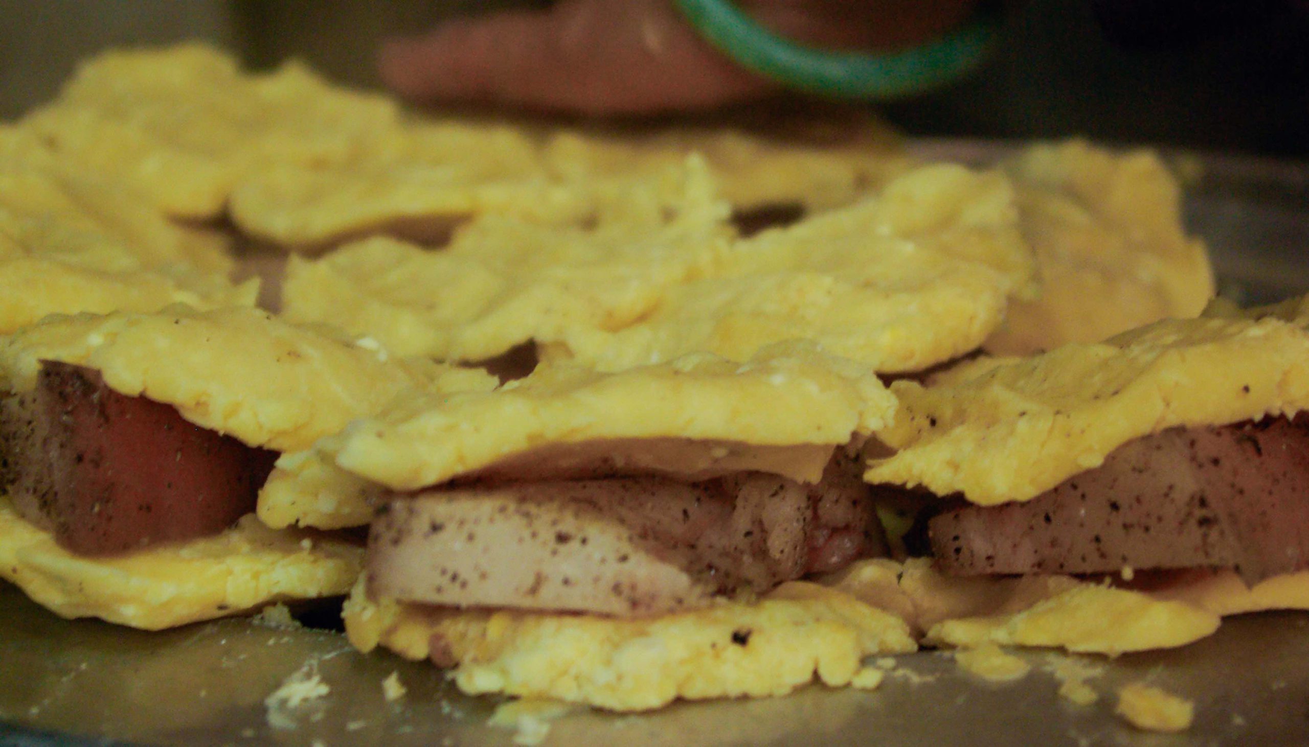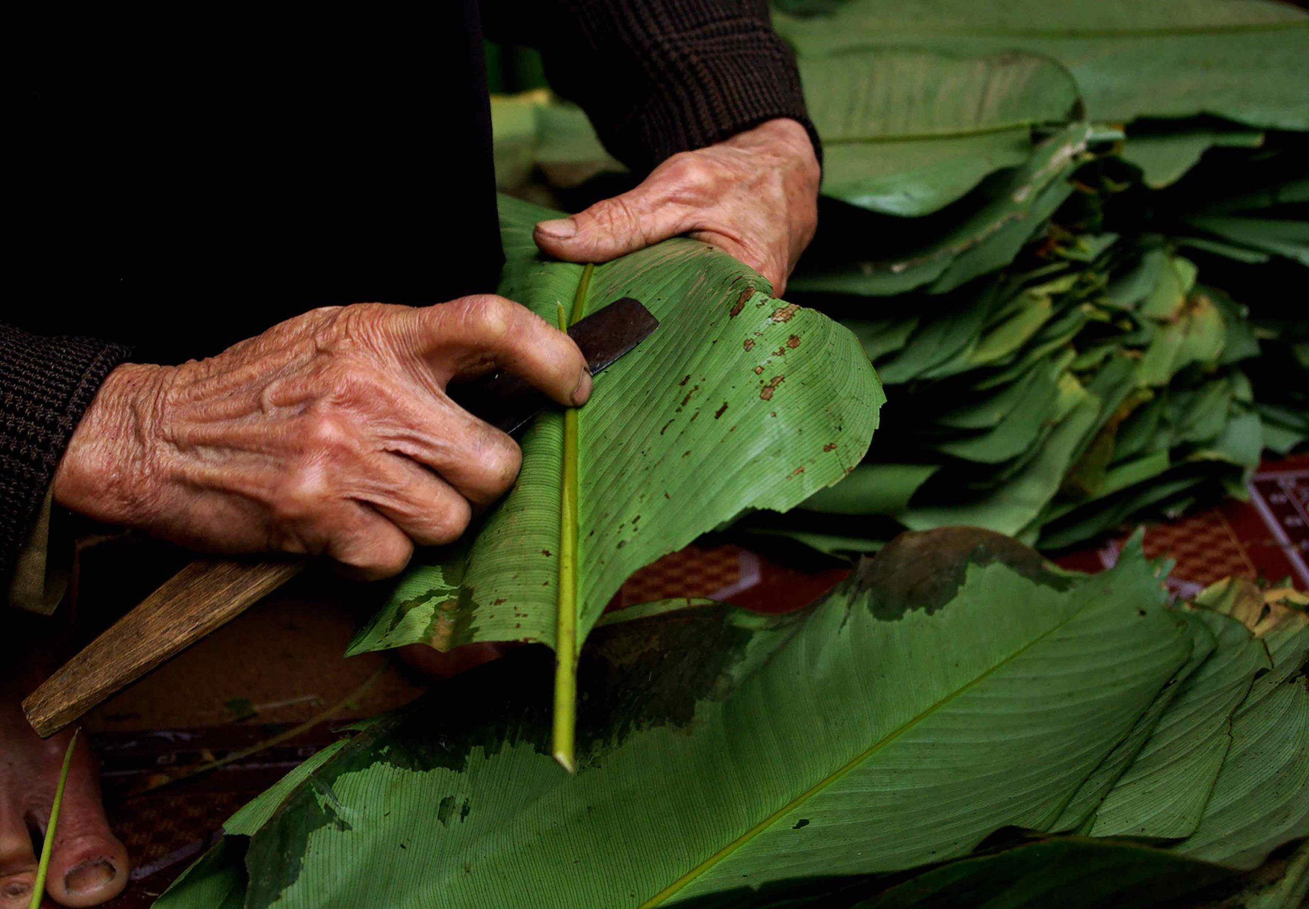 Công đoạn được lũ trẻ mong chờ nhất là gói bánh chưng. Nhiệm vụ quan trọng này được thực hiện bởi ông bà nội. Chúng tôi tíu tít quét sân, trải chiếu, bê lá dong… rồi cùng ngồi ngay ngắn xung quanh đợi ông bà. Những chiếc lá dong xanh mướt được mẹ rửa sạch sẽ, lau khô, tước kĩ phần sống lá, xếp ngay ngắn trên những chiếc mẹt tre nâu bóng màu thời gian. Những nắm đỗ xanh tròn vo, vàng óng cũng đã yên vị trong âu sành cạnh thúng gạo nếp trắng tinh, đầy có ngọn. Thịt ba chỉ đã được thái thành miếng ướp chút muối, trộn đều với hạt tiêu, hành khô băm nhỏ… Tất cả đã vào vị trí, chỉ đợi ông bà nội ngồi xuống chiếu là việc gói bánh bắt đầu.