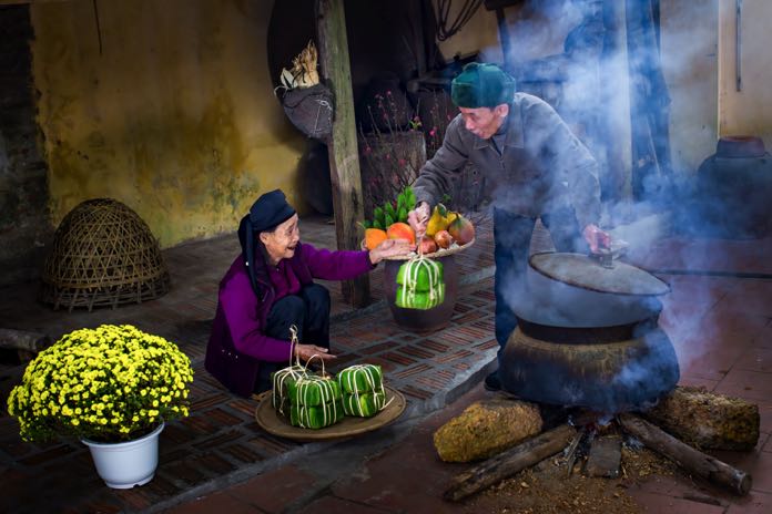 Về cơ bản, mâm cơm ngày Tết xưa và nay không khác nhau, bao gồm bánh chưng xanh, thịt mỡ, dưa hành, nem rán, thịt gà, canh măng, giò lụa, xôi gấc. Đây là những món ăn truyền thống nhất định phải có của người Việt, tạo nên mâm cỗ thịnh soạn nhiều màu sắc và ấm no cho năm mới. Truyền thống của cả gia đình là sẽ cùng nhau ngồi gói bánh chưng và thức đêm để luộc bánh. Đến nay, phong tục này vẫn được lưu giữ trong nhiều gia đình Việt Nam ở cả ba miền.