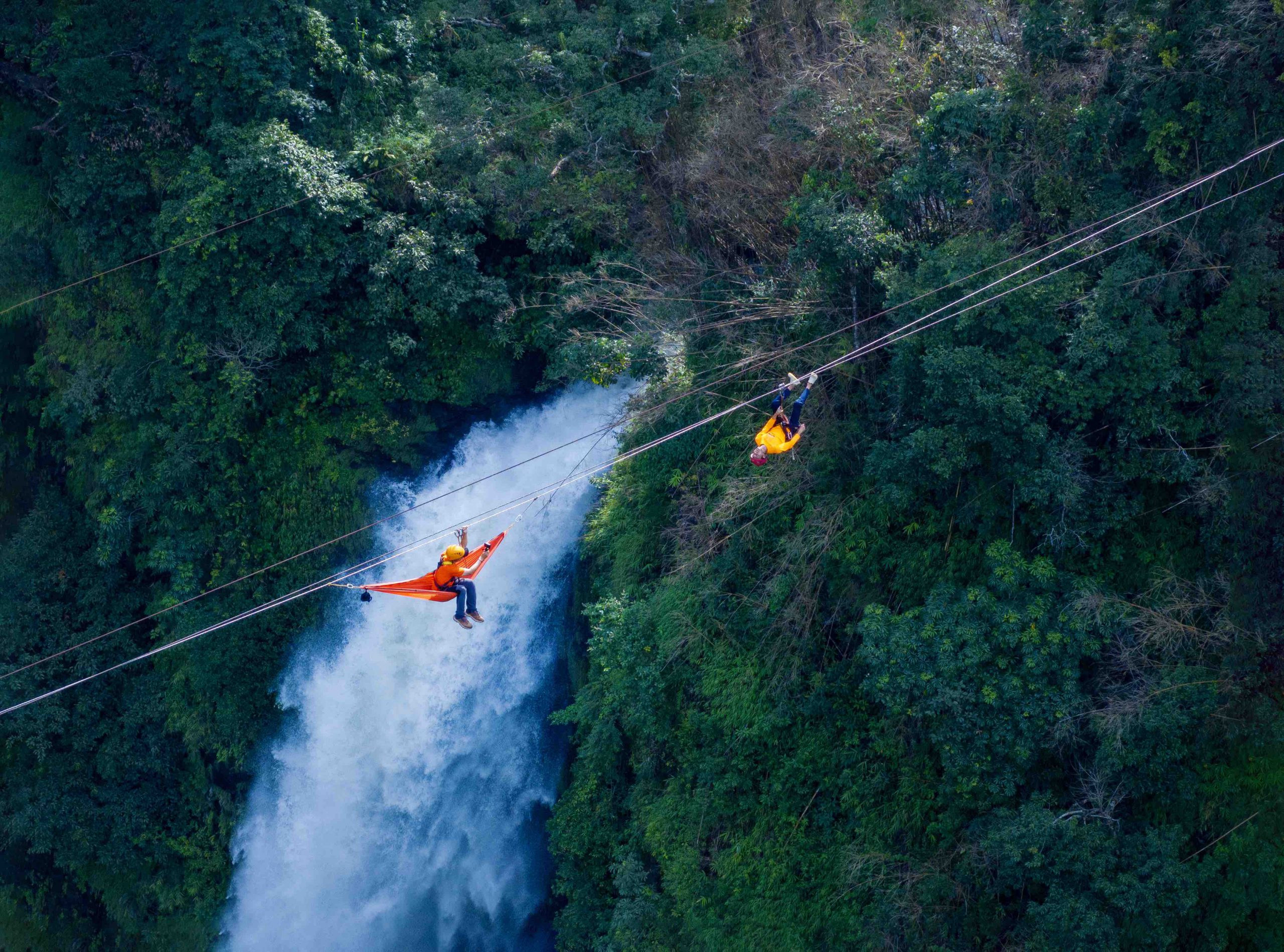 Đầu tiên là trượt zipline băng qua con thác kỳ vĩ. Tim tôi đập thình thịch, adrenaline dâng trào trong huyết quản, tôi hít một hơi thật sâu, rồi buông mình lao vút vào khoảng không. Khoảnh khắc dây cáp căng ra, thân mình lao vun vút giữa hai ngọn thác cuồn cuộn, cảm giác như tê liệt! Gió rít mạnh vào tai, những tán cây rừng lướt qua như chớp nhoáng. Rồi sự sợ hãi ban đầu nhanh chóng tan biến, thay vào đó là sự phấn khích tột độ, một cảm giác chinh phục và tự do tuyệt vời.
