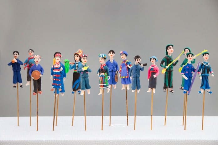 Duyên lành đã đến khi nhóm Vietnam Lens, gồm những người yêu nghệ thuật nhiếp ảnh và luôn trân trọng những giá trị văn hóa, đã tìm đến nghệ nhân Nguyễn Văn Thành với ý tưởng tạo nên bộ tò he về 54 dân tộc anh em. Nhóm Vietnam Lens có những thành viên từng đi tới nhiều vùng miền, gặp gỡ và sinh hoạt cùng các dân tộc thiểu số trên dải đất hình chữ S. Vì thế, họ hiểu rõ đặc trưng của mỗi tộc người với nét đẹp văn hóa bản địa. Họ muốn vẻ đẹp ấy được tỏa lan chứ không chỉ gói gọn trong một vùng đất xa xôi ít người biết đến. Hai bên đã dành thời gian trao đổi kỹ càng để làm nổi bật những chi tiết, tạo hình mà họ muốn thể hiện qua các tác phẩm tò he. Tôi đã không khỏi xúc động khi được ngắm 54 đôi tò he trong trang phục dân tộc với cái hồn sống động. Từng nét vuốt bột tâm huyết, chỉn chu đã khắc họa từ mũ, áo, khăn đội đầu đến nét mặt, dáng điệu… lột tả được vẻ độc đáo của mỗi tộc người. Các cặp trai gái người Bahnar, Ê đê, Jrai khoẻ khoắn trong trang phục thổ cẩm sặc sỡ, chơi nhạc cụ cồng, chiêng. Chàng trai người Tày mặc chiếc áo màu chàm đang thổi sáo bên người bạn gái chơi đàn tính. Cô gái Thái vấn tóc điệu đà với chiếc khăn piêu, áo cóm và váy đen duyên dáng… Nghệ nhân Nguyễn Văn Thành chia sẻ rằng thời gian để tạo mỗi đôi tò he lâu hơn rất nhiều so với những mẫu phổ biến, từ khâu pha bột để ra được đúng màu trang phục đến việc tạo hình dáng, cử chỉ, cách chơi nhạc cụ dân tộc…