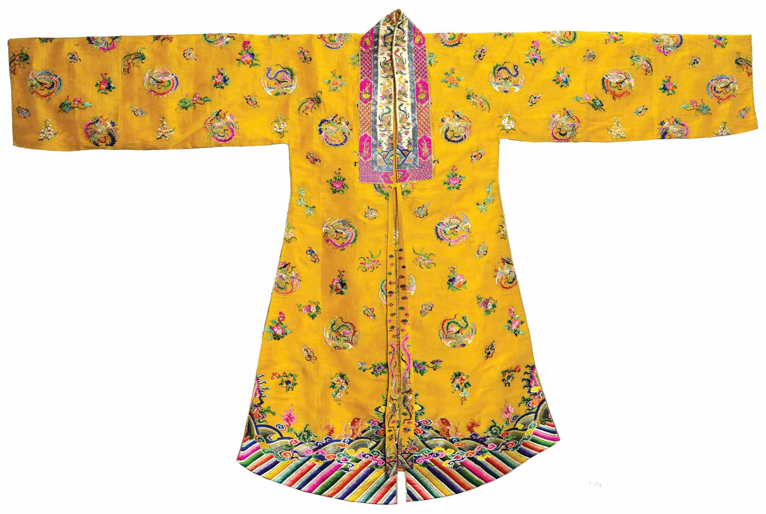 Theo điển chế, áo Nhật bình sắc vàng chỉ dành bậc Hậu (Hoàng hậu, Thái hậu và Hoàng thái hậu). Áo sử dụng nền là chất liệu sa nam dệt mỏng nhuộm màu chánh hoàng (vàng thuần, có chút ánh nâu rất đặc trưng của triều Nguyễn), bên trong lót lụa dệt hoa (damask) màu vàng cam. Cổ áo được thêu dày đặc 9 con phượng thể hiện danh phận tôn quý. Thân áo trang trí 47 hình đoàn phượng (phượng cuộn tròn) đa dạng dáng bay, xen kẽ Bát bửu Đạo giáo và các loài hoa mĩ miều. Trong đó, đặc biệt nhất là sự xuất hiện của các khóm hoa sen với tạo hình vô cùng Việt Nam mà dường như chưa từng thấy trên bất cứ cổ vật y áo nào. Ngoài việc thiếu vắng các hạt kim sa lấp lánh, viền cổ áo và viền thân áo còn được nẹp bằng loại kim tuyến “soutache” dạng thừng của châu Âu thay cho chất liệu kim tuyến giấy Trung Hoa vốn mỏng manh lại mau chóng bị oxy hóa, thể hiện sự giao thoa kĩ nghệ Tây-Ta cấp tiến thời bấy giờ. Hơn 7 thập kỷ qua bao thăng trầm lịch sử, cổ vật đã được trả về nơi xưa chốn cũ, trở thành tài sản vô giá cho cố đô Huế.