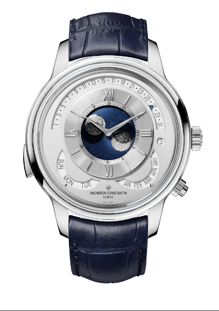 Ở mặt trước của đồng hồ, người ta bị thu hút bởi hình ảnh mô tả các mặt trăng ở hai bán cầu trên một đĩa đồng trục với các kim ở giữa và có hình dạng giống như một mái vòm đầy sao. Màu xanh đậm của đồng hồ tạo nên sự tương phản nổi bật với màu bạc của mặt số khi nó thực hiện một vòng quay hoàn chỉnh trong 59 ngày, 12 giờ và 45 phút.