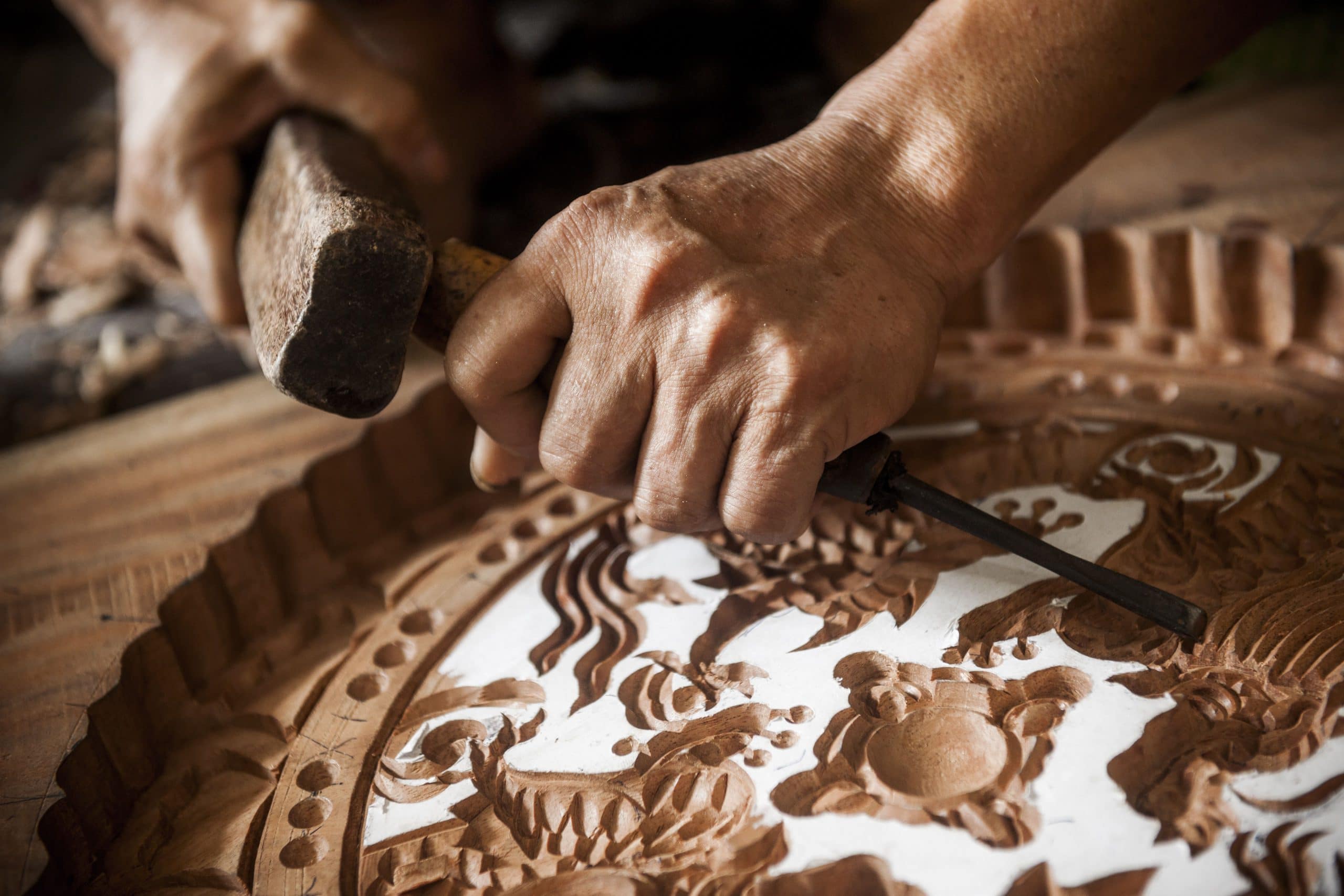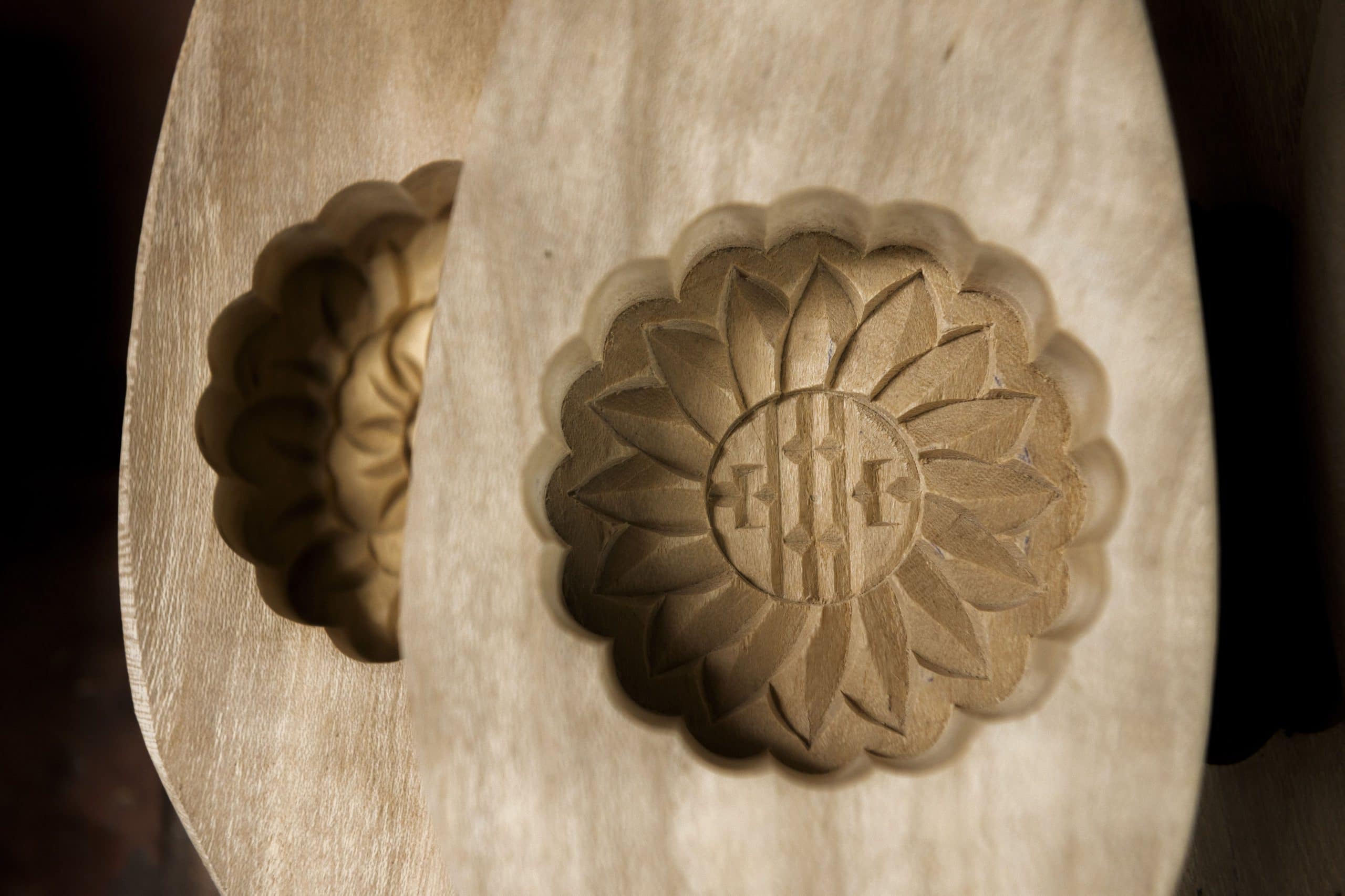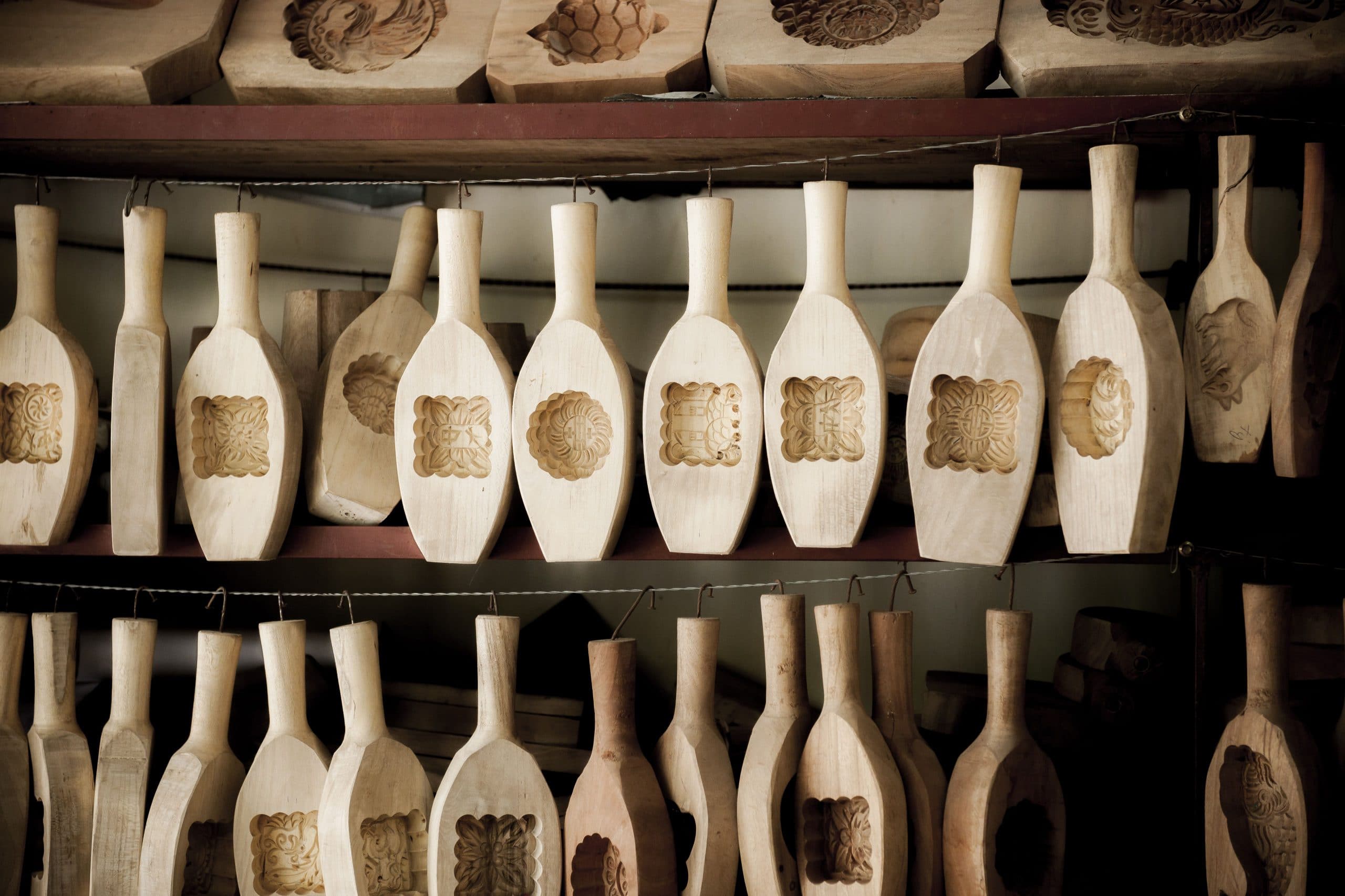 Quả thật, để làm ra một khuôn bánh Trung thu hoàn chỉnh phải trải qua nhiều công đoạn. Ban đầu là xử lý độ ẩm của gỗ, cắt phôi, bào nhẵn, kẻ mực rồi ngâm mỡ. Công đoạn này phải làm thật kỹ vì có kỹ thì sau này khuôn mới không bị dính chặt bột. Ông Bản chia sẻ thêm: “Mà gỗ làm khuôn phải là gỗ xà cừ, loại gỗ có tuổi thọ cao, ít bị ẩm mốc, để không ảnh hưởng đến chất lượng bánh sau này”. Sau khi khuôn gỗ đã lên khối thì sẽ được người thợ dung compa đo kích thước dài rộng rồi vẽ khuôn, bào khuôn, đục hoa văn… Khuôn tròn, vuông, hoa văn như mai trúc cúc sen… đến các hình thù cầu kỳ như rồng phượng, mây lá, cá, 12 con giáp, đàn lợn mẹ con… đều được làm từ chính đôi bàn tay khéo léo của người thợ với sự trợ giúp của bộ dùi đục gồm 24 chiếc.