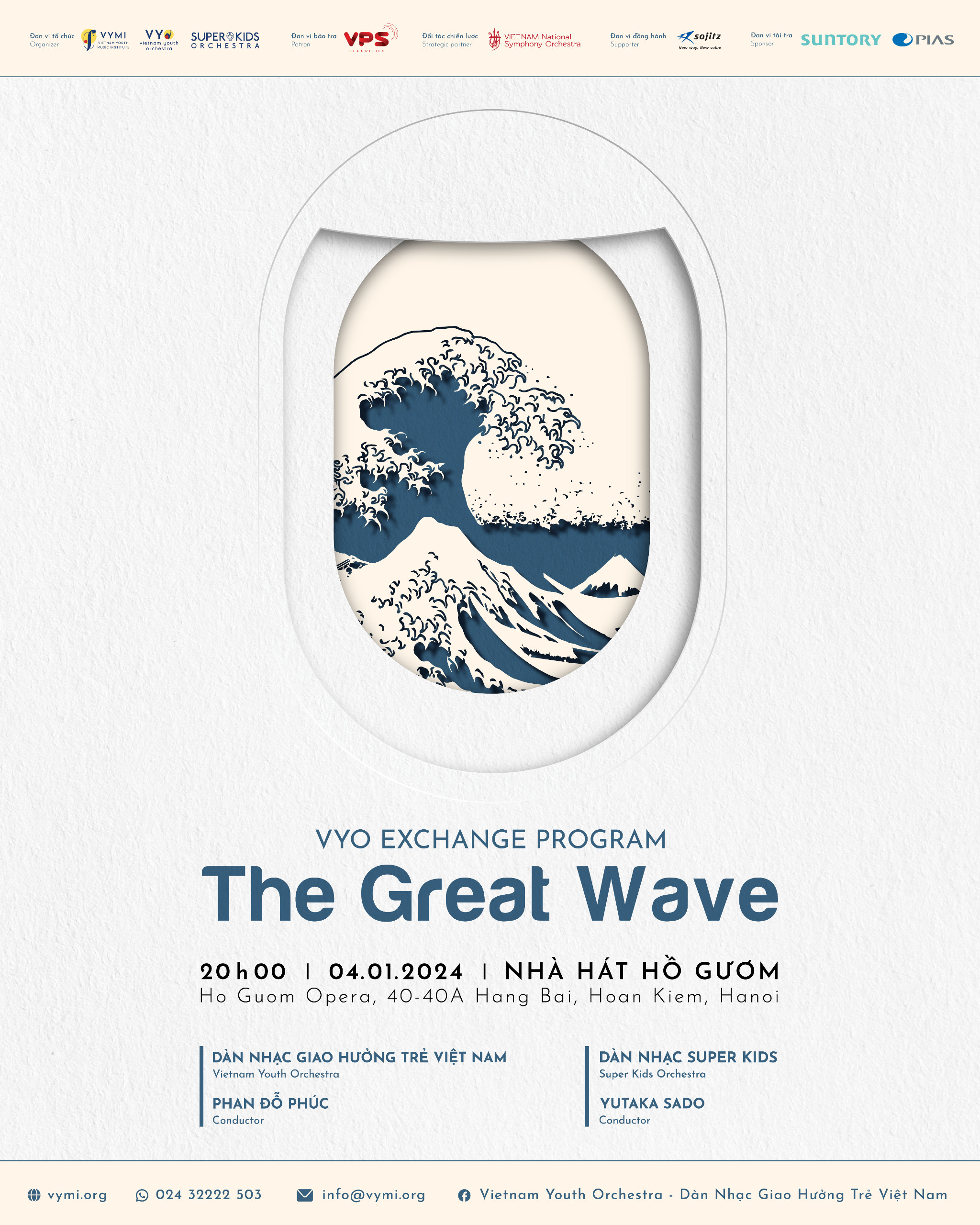 Chương trình hòa nhạc The Great Wave sẽ diễn ra vào ngày 4/1/2024 tại Nhà hát Hồ Gươm, Số 40 Phố Hàng Bài, Hoàn Kiếm, Hà Nội.