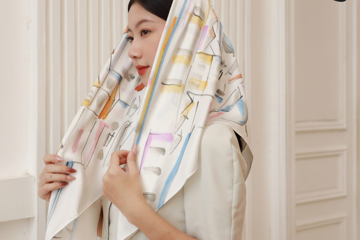 Chiếc khăn lụa vì thế không chỉ là điểm nhấn thẩm mỹ. Nó là biểu tượng cho tâm hồn nghệ sĩ và khả năng biến những điều bình thường trở nên tinh tế – như cách người phụ nữ khiến thế giới quanh mình trở nên đẹp hơn từng ngày.