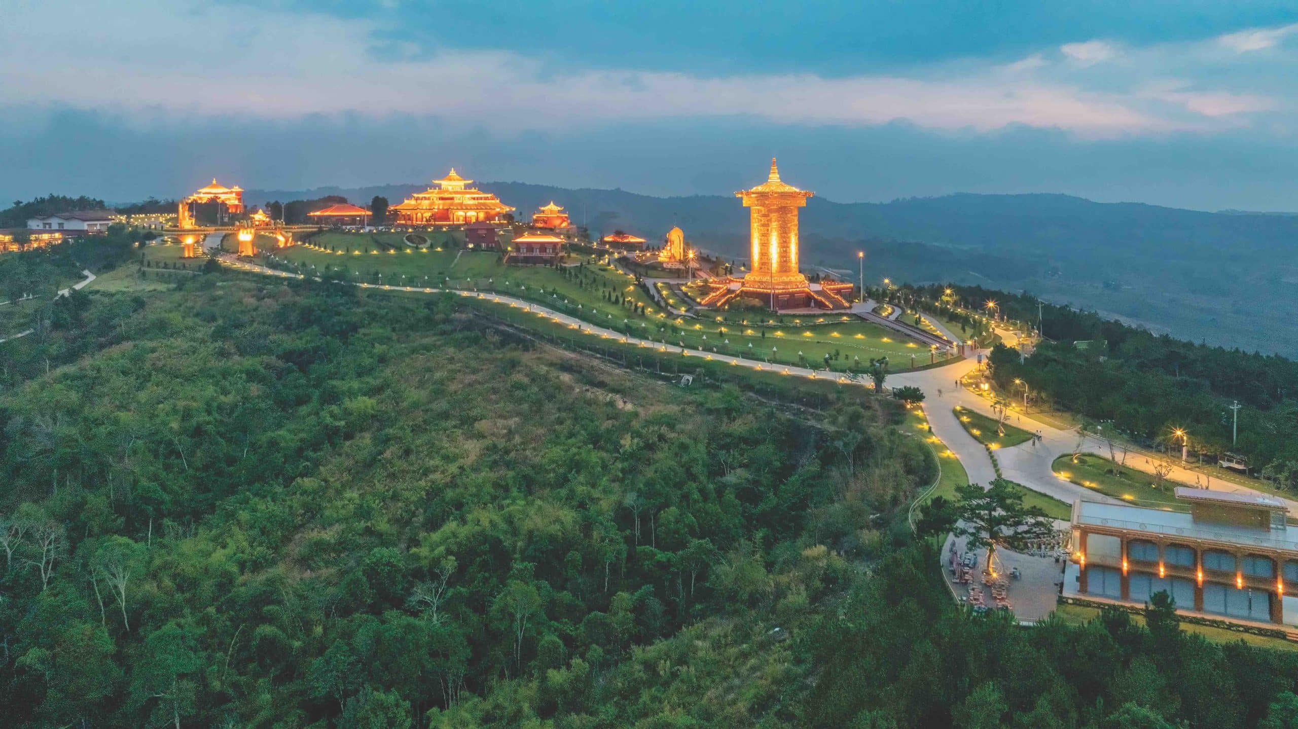 Càng về khuya, Satem Hills lại càng mang vẻ huyền ảo. Dưới ánh đèn, những công trình kiến trúc Phật giáo rực sáng lộng lẫy. Các tác phẩm hội họa và họa tiết trang trí nhiều màu sắc bừng lên trong màn đêm. Từng lớp sương trắng lững lờ buông trên ngọn tháp, mái nhà, hàng cây. Trong đêm tĩnh lặng và không gian linh thiêng, sự kết nối sâu sắc với thiên nhiên càng được cảm nhận rõ ràng hơn. Những năng lượng tốt lành đã đi cùng chúng tôi vào tận giấc ngủ nhẹ nhàng, êm ái.