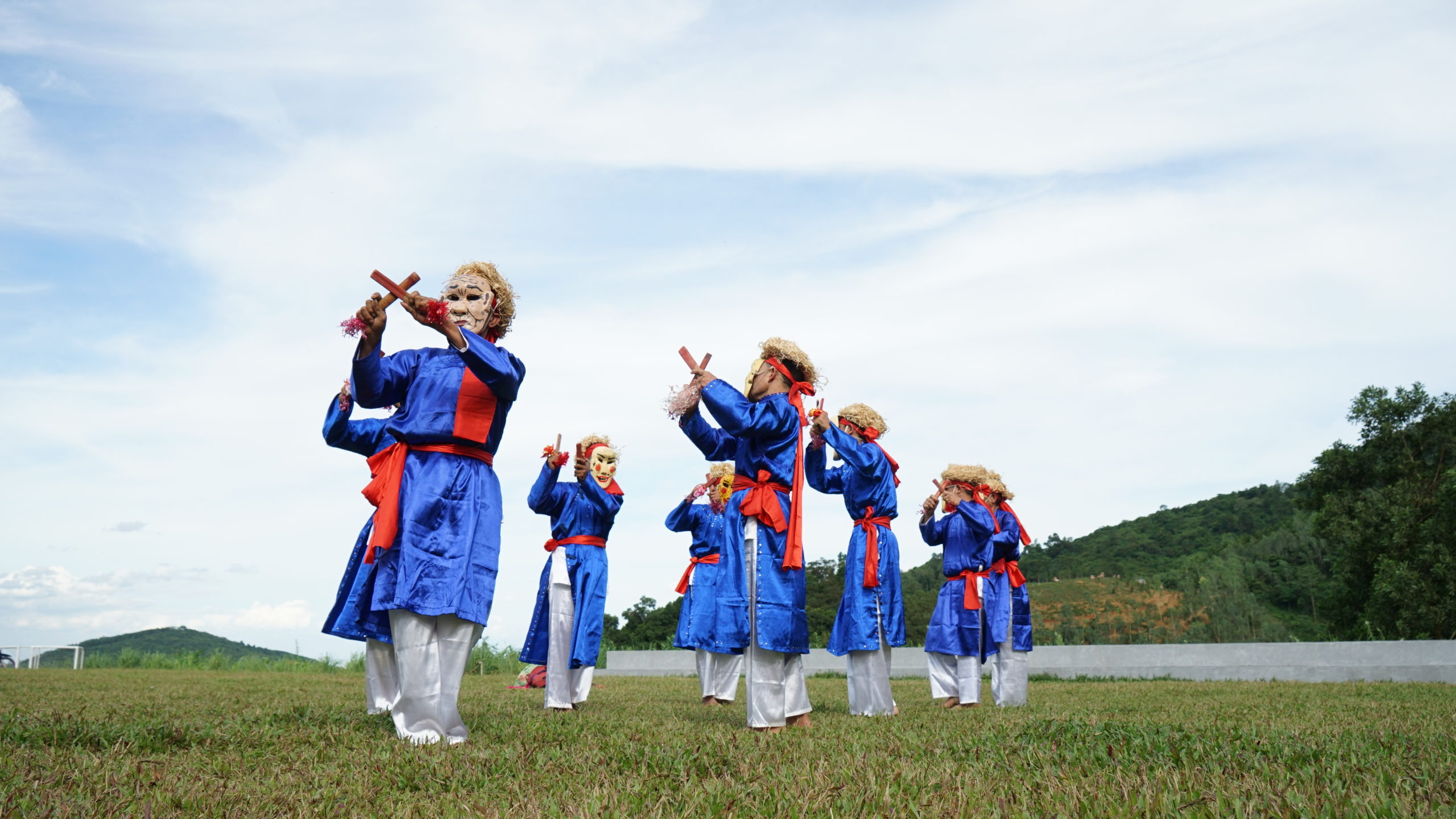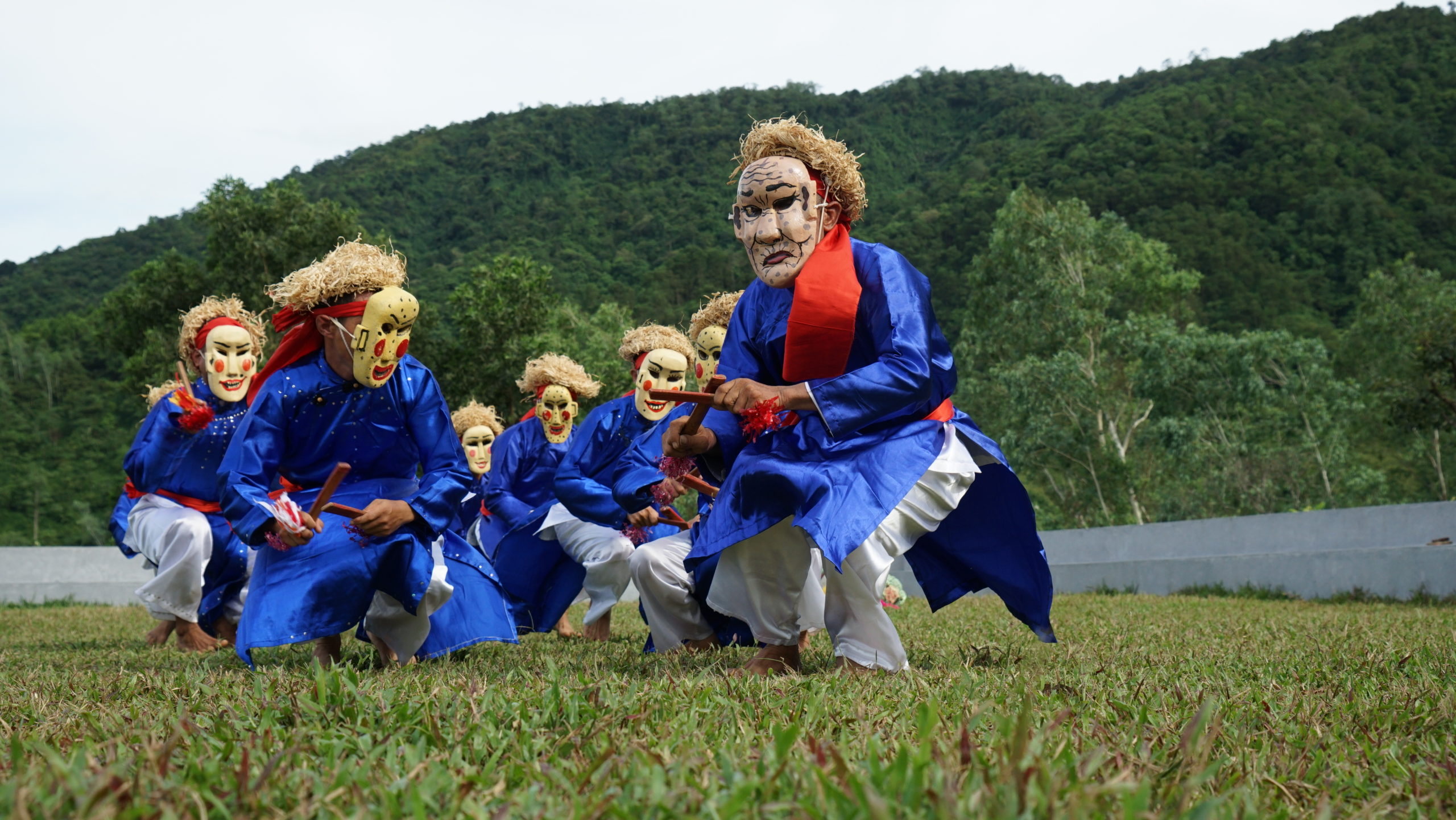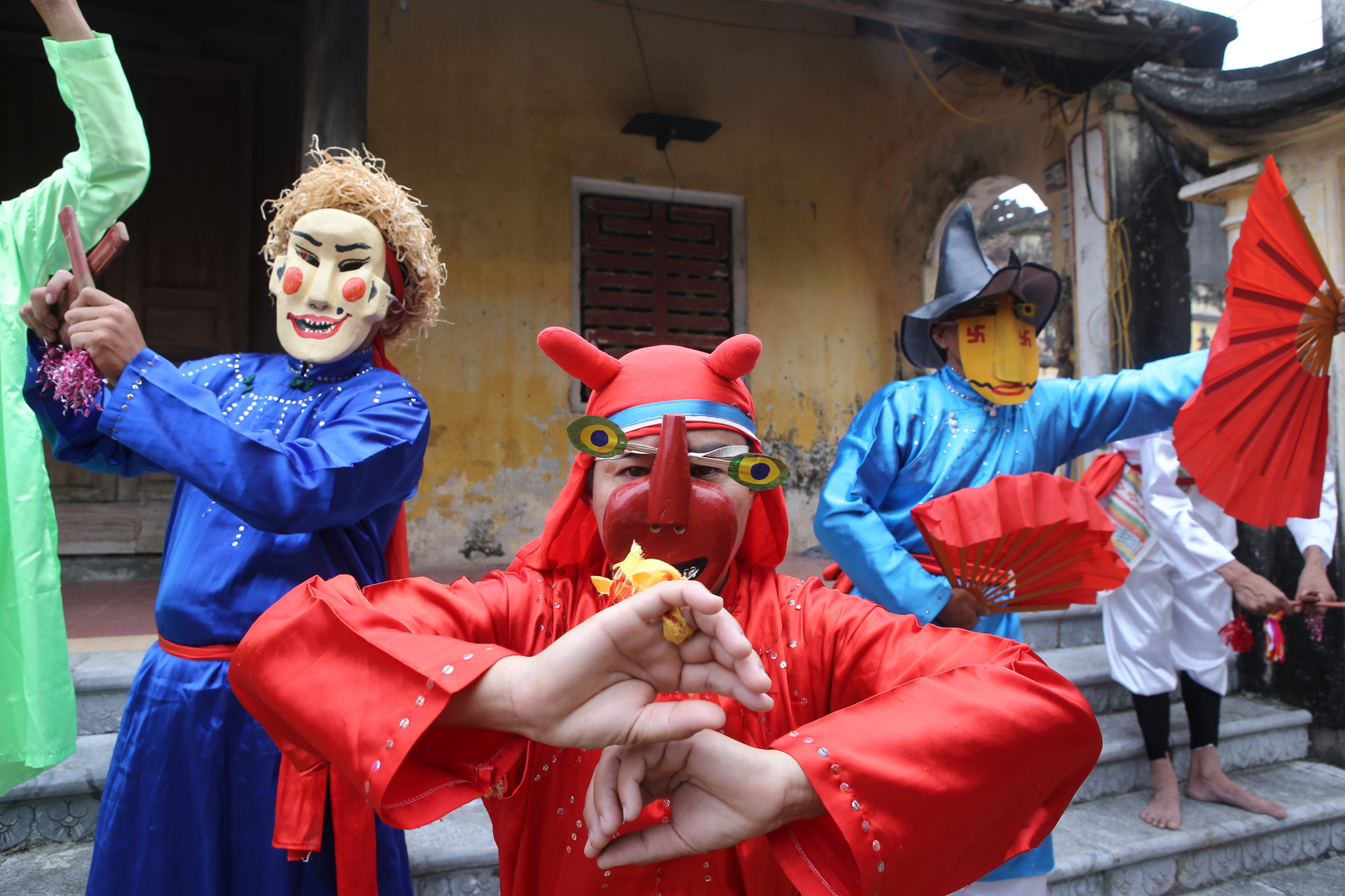 Trong năm trò diễn, mỗi trò có một đặc trưng riêng. Không chỉ khác nhau về điệu múa mà các nghệ nhân còn sử dụng màu sắc trang phục, mặt nạ, mũ, râu tóc để thể hiện nét đặc trưng chủng tộc. Riêng ba trò Chiêm Thành, Hoa Lang và Tú Huần có mặt nạ. Đặc biệt, trong trò Chiêm Thành và Hoa Lang người múa không đeo mà ngậm mặt nạ nửa mặt. Phía sau mặt nạ có một chốt gỗ để ngậm vào miệng, giữ cho mặt nạ không rơi. Các trò Tú Huần, Hoa Lang và Ngô Quốc lại có bài hát. Còn hai trò Hoa Lang và Ngô Quốc có cảnh cô gái Việt ra tiếp đón đoàn nước lân bang đến chúc mừng.