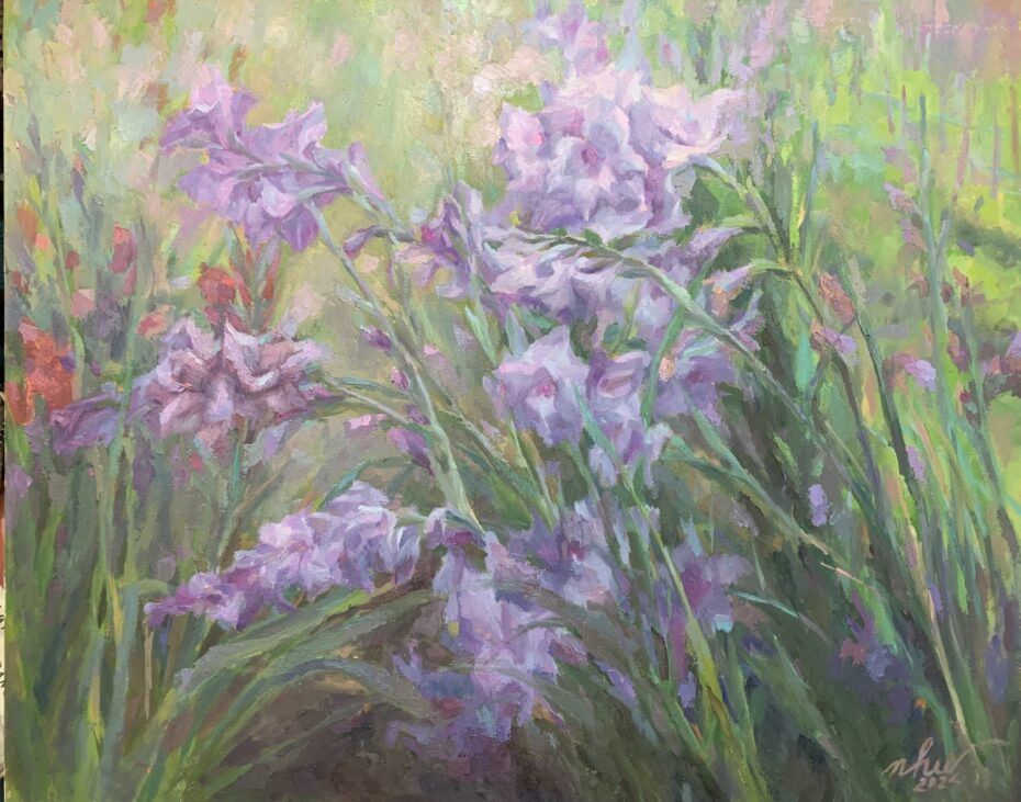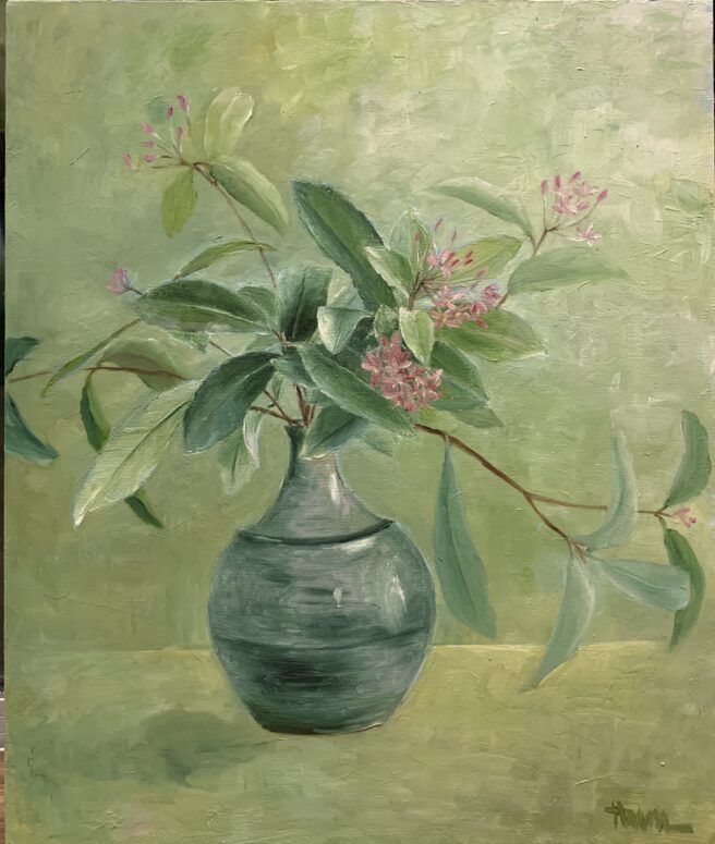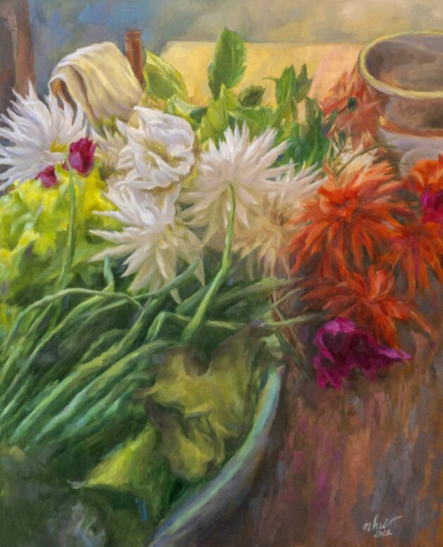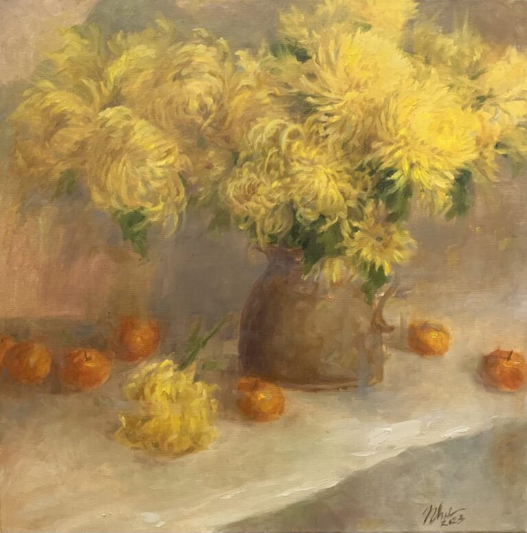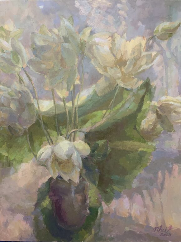 Trong tranh của tôi, tôi thường vẽ những bông hoa ở rất nhiều giai đoạn khác nhau, đứng cạnh nhau, bên nhau, một cách rất tự do phóng khoáng. Chúng an yên không lo lắng về tương lai, không hối tiếc về quá khứ, chúng rực rỡ theo cách riêng trong phút giây chạm vào ánh nắng, chạm vào cơn gió… và nhờ thế mà chúng trở nên đẹp một cách an bình.