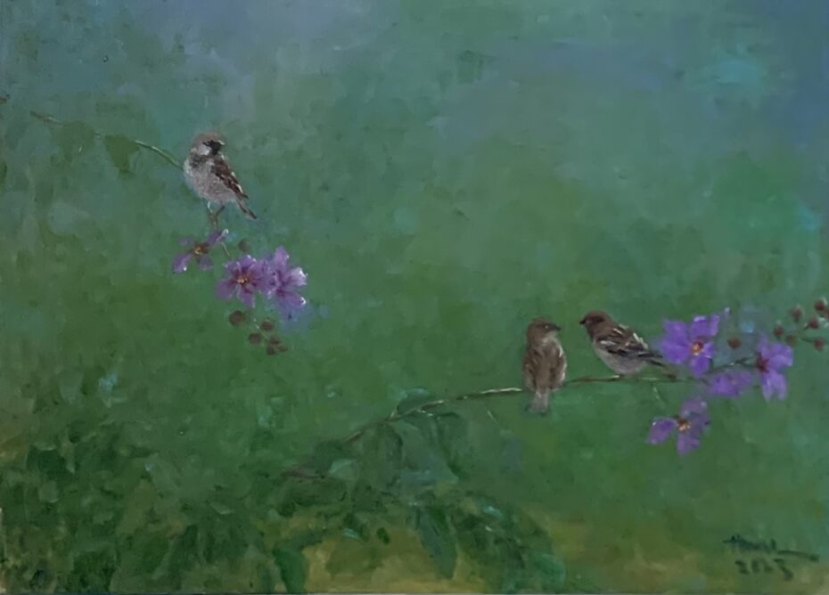 Vậy còn sự mong manh và giản dị thì sao? Tôi ấn tượng rằng trong tranh của chị thường xuất hiện những chú chim lặng lẽ đứng bên cạnh hoa. Cả hai vật thể này bổ trợ cho nhau, nhưng kỳ thực không làm vơi đi cảm giác mong manh.
