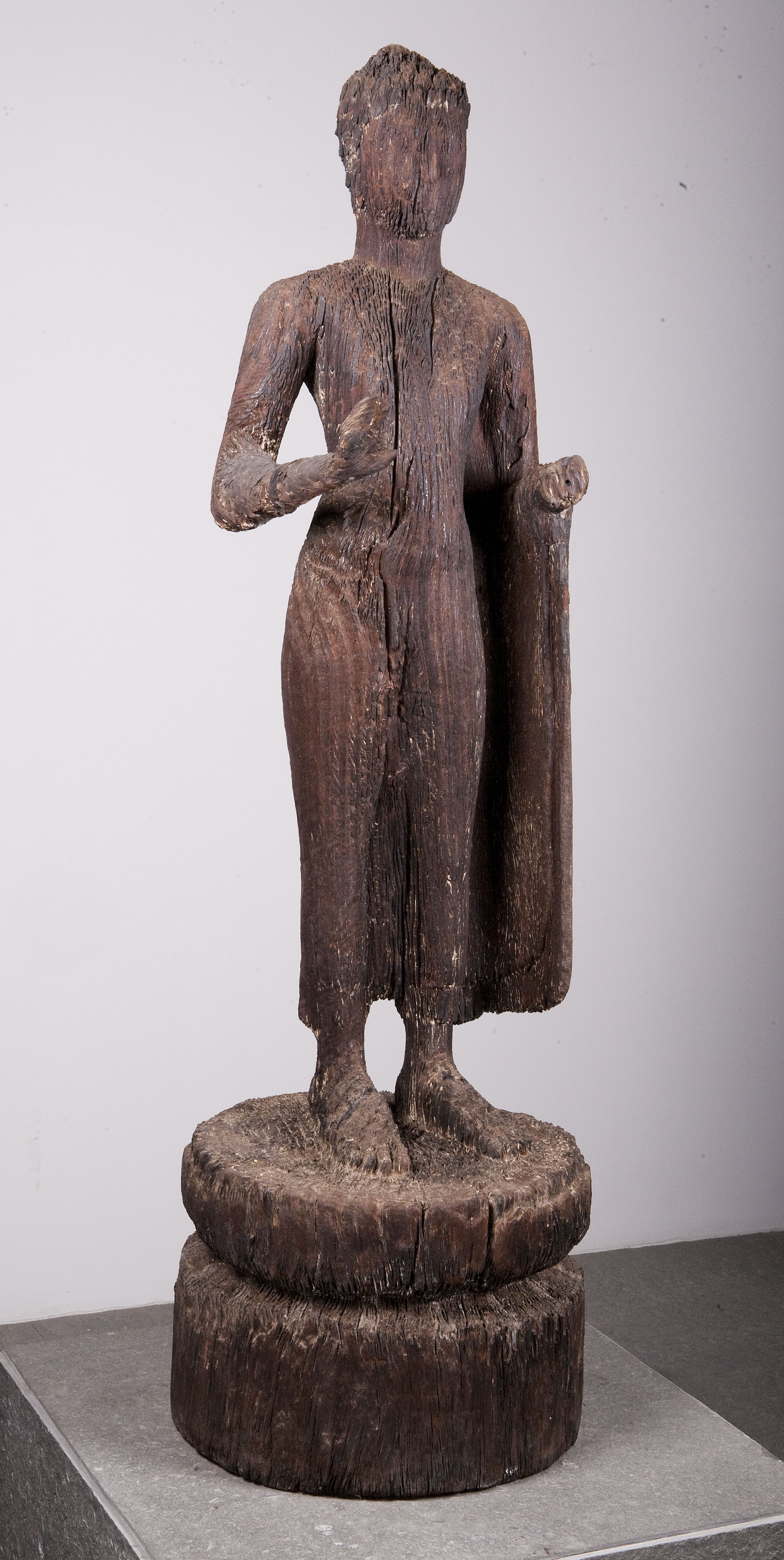 Nét đặc sắc nổi bật của điêu khắc Phật giáo Phù Nam là các pho tượng Phật Thích Ca trong tư thế đứng trên bệ sen, được tạc nguyên khối từ gỗ sao hoặc gỗ mù u. Phần nhiều các tượng gỗ này mất hết tay, dấu vết còn lại cho thấy tay tượng chủ yếu bắt ấn Vô úy (Abhaya) và Thí nguyện (Varada). Thời kỳ sớm (thế kỷ 2 – 4), tượng Phật gỗ được thể hiện trong tư thế Tribhanga, hông lệch mạnh về bên phải, cơ thể thon mảnh uốn thành 3 khúc ngược chiều nhau tạo hình chữ S cong nhẹ rất duyên dáng và gợi cảm. Lối thể hiện này chịu ảnh hưởng từ phong cách nghệ thuật Amaravati Ấn Độ. Tuy nhiên, ta vẫn nhận ra những nét riêng qua một số đặc điểm tiểu tượng như Ushnisha (u tròn trên đỉnh đầu tượng Phật) chỉ nổi nhẹ hoặc hình búp nhọn, khuôn mặt thon, cổ cao, ngực lép. Tượng mang áo mỏng, bó sát thân, để lộ rõ đường nét cơ thể chứ không tạo thành nhiều nếp dày và nặng như phong cách Amaravati. Giai đoạn phát triển (thế kỷ 5 – đầu thế kỷ 6), các tượng Phật gỗ chuyển sang tư thế Abhanga, hông chỉ lệch nhẹ về bên phải, thân trên thẳng, cơ thể thiếu đi sự gợi cảm so với nhóm tượng Tribhanga. Khuôn mặt được thể hiện theo nhiều kiểu khác nhau như mặt trái xoan, mặt chữ điền. Những đặc điểm này bắt nguồn từ phong cách nghệ thuật Gupta Ấn Độ. Trong thế kỷ 6, tượng Phật gỗ lại thêm một lần chuyển đổi phong cách do bắt nguồn từ cảm hứng nghệ thuật Gupta muộn. Theo đó, tượng được tạc trong tư thế đứng thẳng, cơ thể khô cứng hơn cả, trang phục phủ kín một bên vai, tà áo buông dài tới ngang chân. Khuôn mặt không có sự khác biệt nhiều so với các nhóm tượng Phật gỗ giai đoạn trước. Dấu ấn bản địa hóa của nhóm tượng ảnh hưởng phong cách nghệ thuật Gupta thể hiện rõ nét trên áo choàng. Theo đó nó chỉ choàng lệch một bên vai chứ không phủ kín hai vai và không nhiều nếp gấp như tượng Gupta nguyên gốc Ấn Độ.