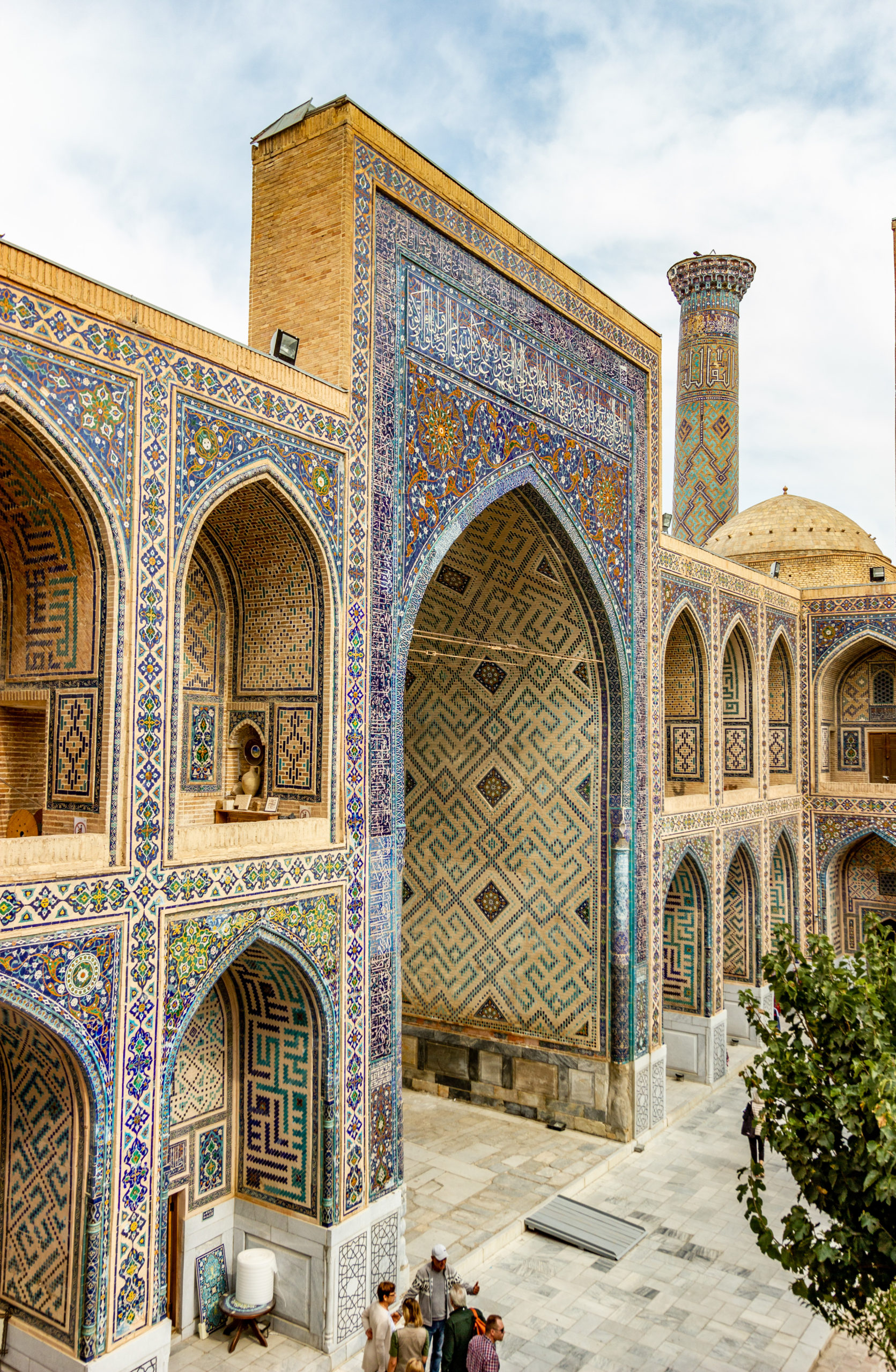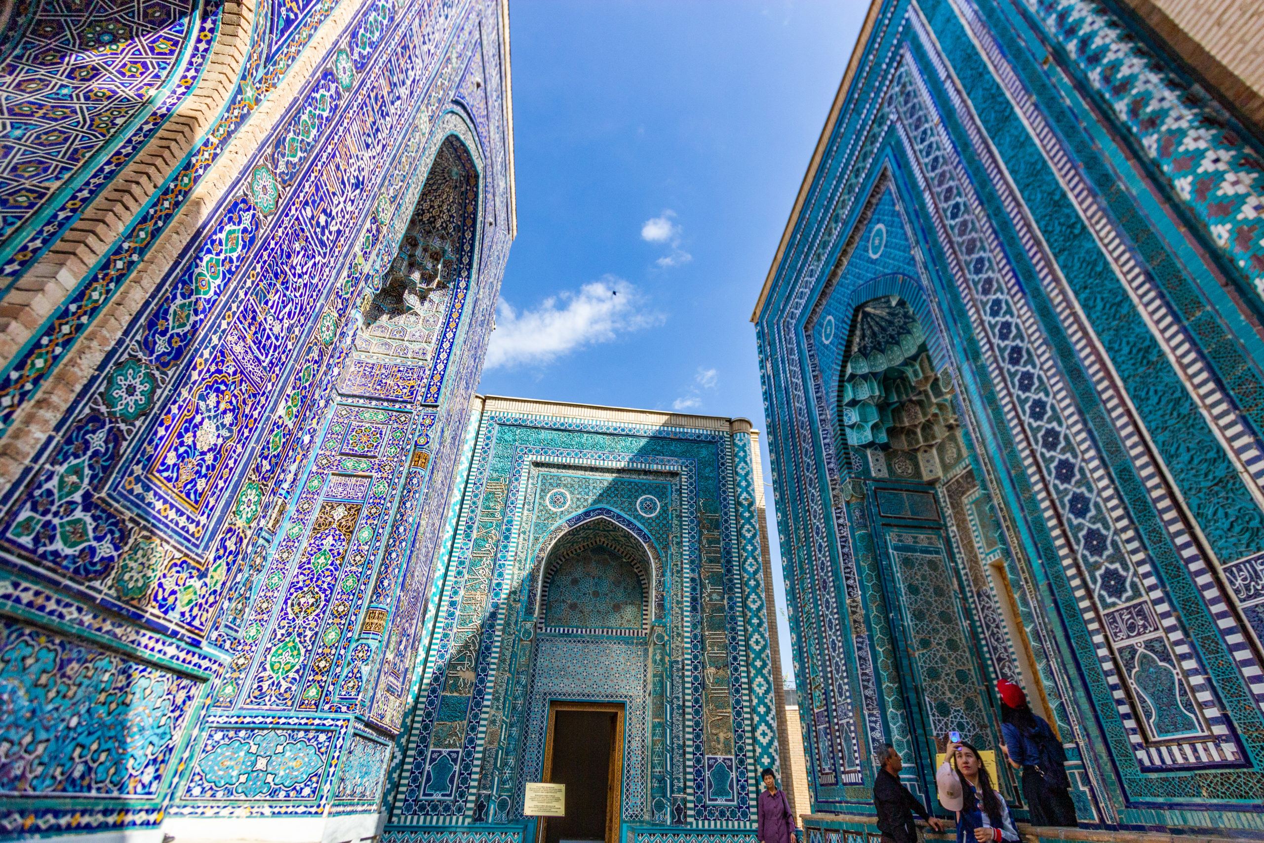 Trên quảng trường Registan có ba học viện Hồi giáo Ulugh Beg, Tilya Kori và Sher-Dor. Quần thể kiến trúc này đã trở thành một tượng đài của kiến trúc phương Đông. Thánh đường Bibi-Khanym được đặt theo tên người vợ được sủng ái của Timur. Bà đã ra lệnh xây dựng thánh đường nhằm vinh danh chiến thắng tại Ấn Độ của Timur. Hơn hai trăm kiến trúc sư, thợ thủ công bậc thầy và năm trăm nô lệ đã được huy động để xây dựng nơi này. Gần năm trăm cột đá đã được cắt và vận chuyển bằng voi từ các mỏ đá cẩm thạch tới Samarkand. Mái vòm của sảnh chính cao tới 41m, nơi này đã từng là nhà thờ hồi giáo lớn nhất thời kỳ đó. Phần bên ngoài và bên trong của mặt tiền cổng vòm của các công trình kiến trúc tại Samarkand đều được trang trí bằng nhiều loại gạch men với hoa văn chạm khắc tinh xảo, sống động. Tổng thể, các công trình xây dựng đều có nhiều gam màu xanh tượng trưng cho bầu trời, xanh ngọc là màu của sự sống và màu vàng của mặt trời.