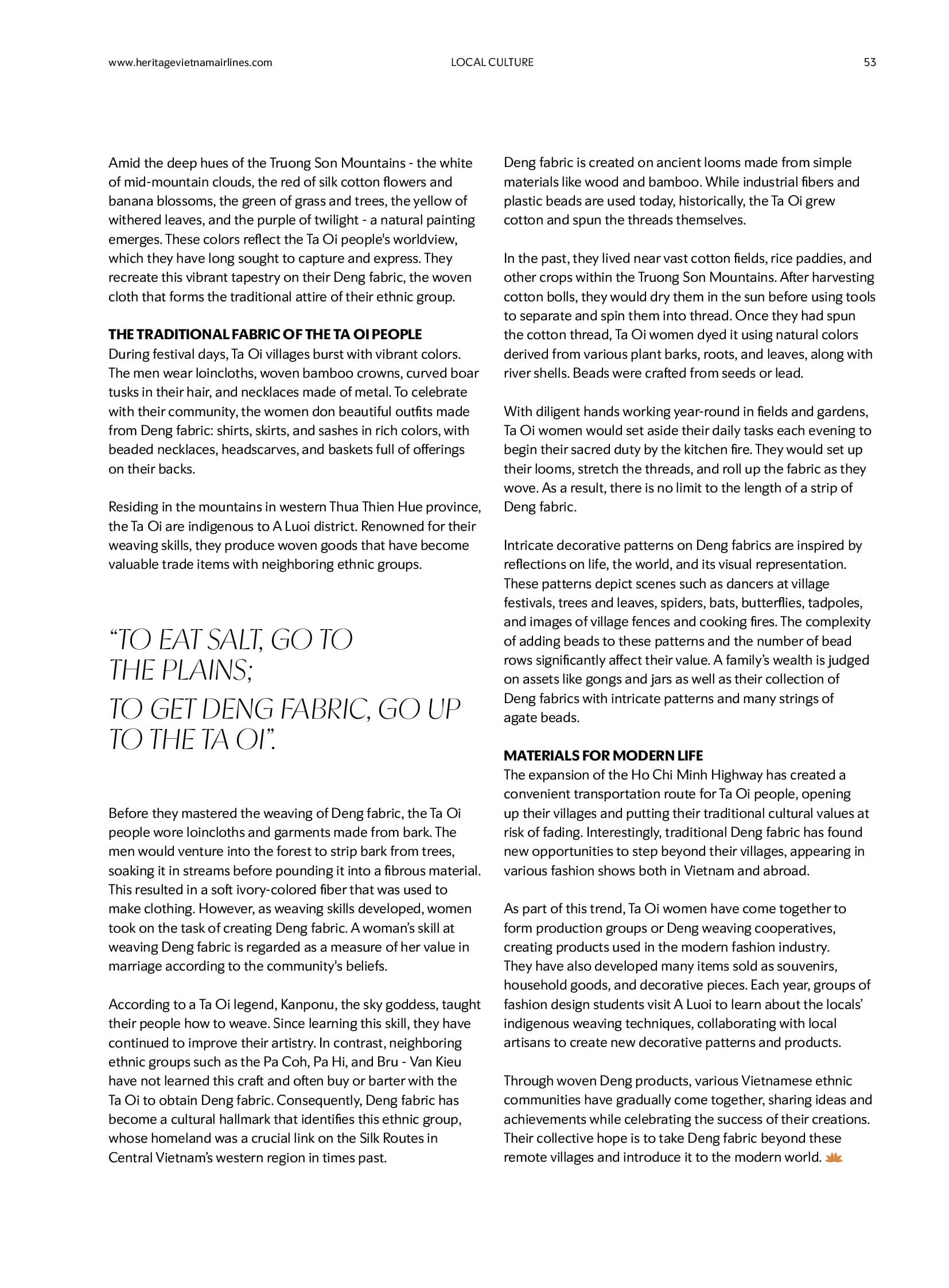 Chuyên trang về di sản, văn hóa, kinh tế, du lịch và xã hội với các bài viết đặc sắc khám phá vẻ đẹp, ý nghĩa lịch sử của các di sản Việt Nam và thế giới. Heritage đã và đang phát triển sứ mạng cầu nối văn hóa của mình và luôn được lựa chọn là ấn phẩm ngoại giao của Việt Nam trong hơn 30 năm qua.