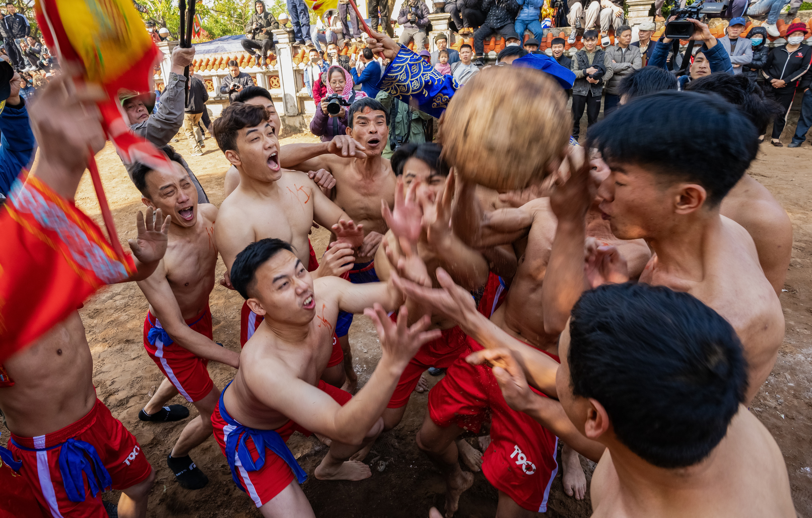 Quả cầu được làm từ củ chuối hột, nặng 15kg, gọt tròn, đẽo nhẵn, được vùi trong một hố nhỏ ở giữa sân. Hai bên trái – phải sân đặt hai bồ được đan bằng tre, gắn trên một cột gỗ sơn màu đỏ, cao chừng 2m. Sau hiệu lệnh bắt đầu, quả cầu nhanh chóng được lấy lên. Đây là thời điểm mang tính quyết định, quả cầu tròn nhẵn, rắn và nặng nên đòi hỏi người chơi phải can đảm, biết phát huy sức mạnh tập thể, vừa hò hét vừa dùng lực từ đôi tay đẩy cầu lên cao.