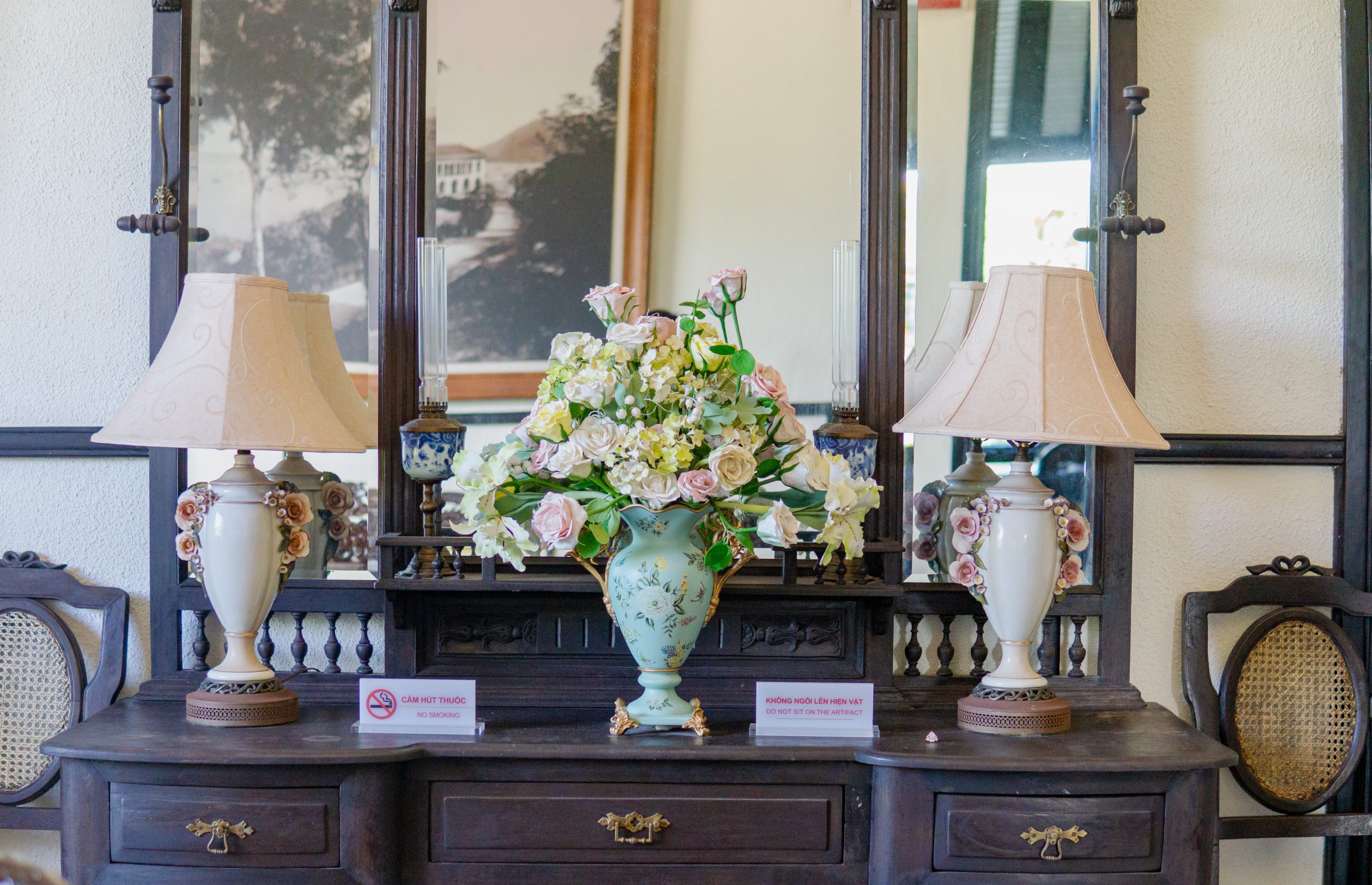 Nếu kiến trúc tòa nhà đậm nét châu Âu thì những món đồ nội thất cùng nhiều cổ vật lại có sự kết hợp Đông Tây, với những món đồ đặc trưng cung đình như song bình Bách điểu chầu phụng, bộ tràng kỷ Hoàng Gia ghi niên đại Khải Định năm 1921, cặp ngà voi châu Phi dài 158cm, bộ tam đa ngũ thái Phúc – Lộc – Thọ. Trong khi đó, đồ gỗ phòng riêng của vua Bảo Đại và hoàng hậu Nam Phương lại thể hiện tinh thần hiện đại với phong cách chú trọng các đường cong mạnh mẽ và các mảng uốn trơn, giảm thiểu các họa tiết.
