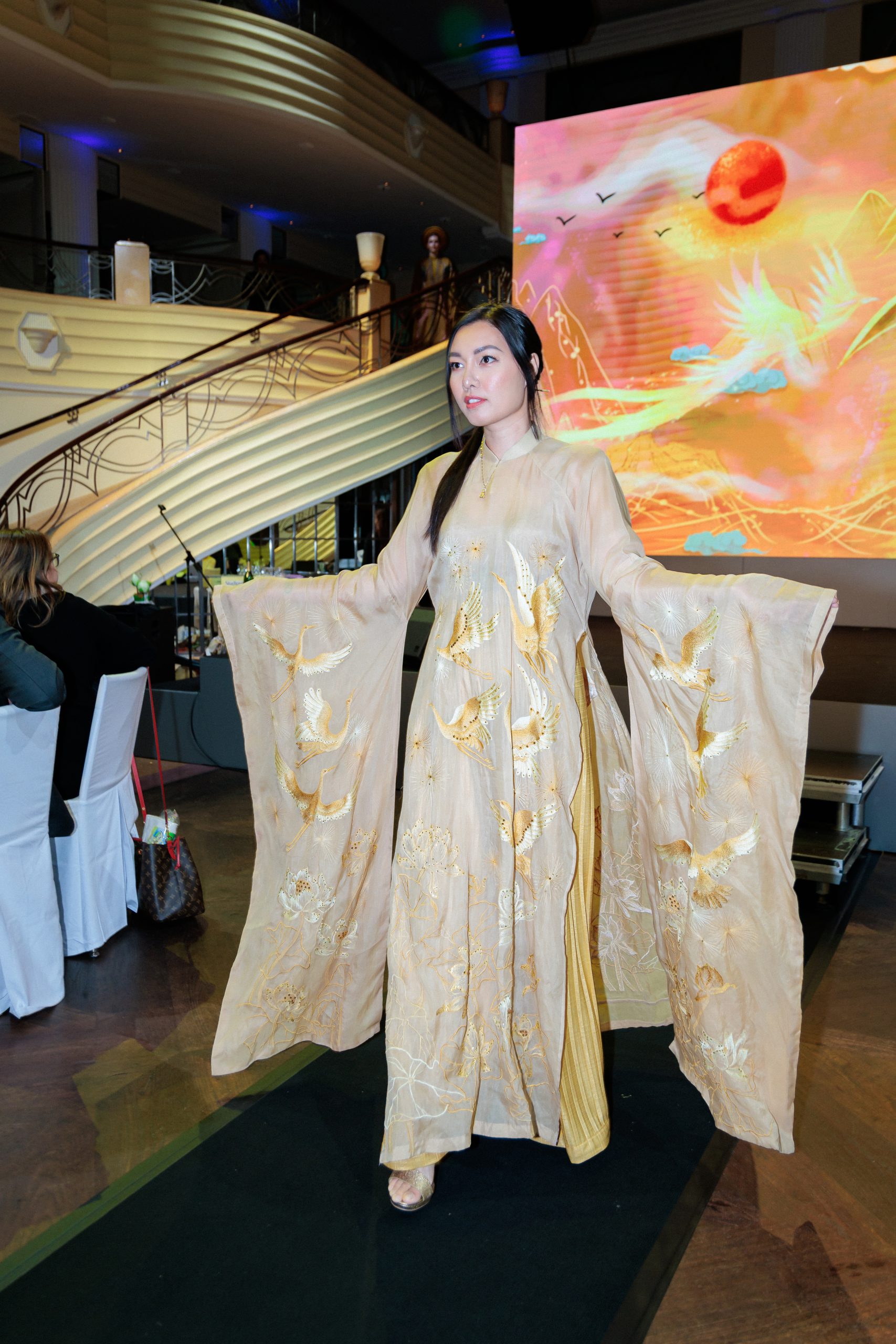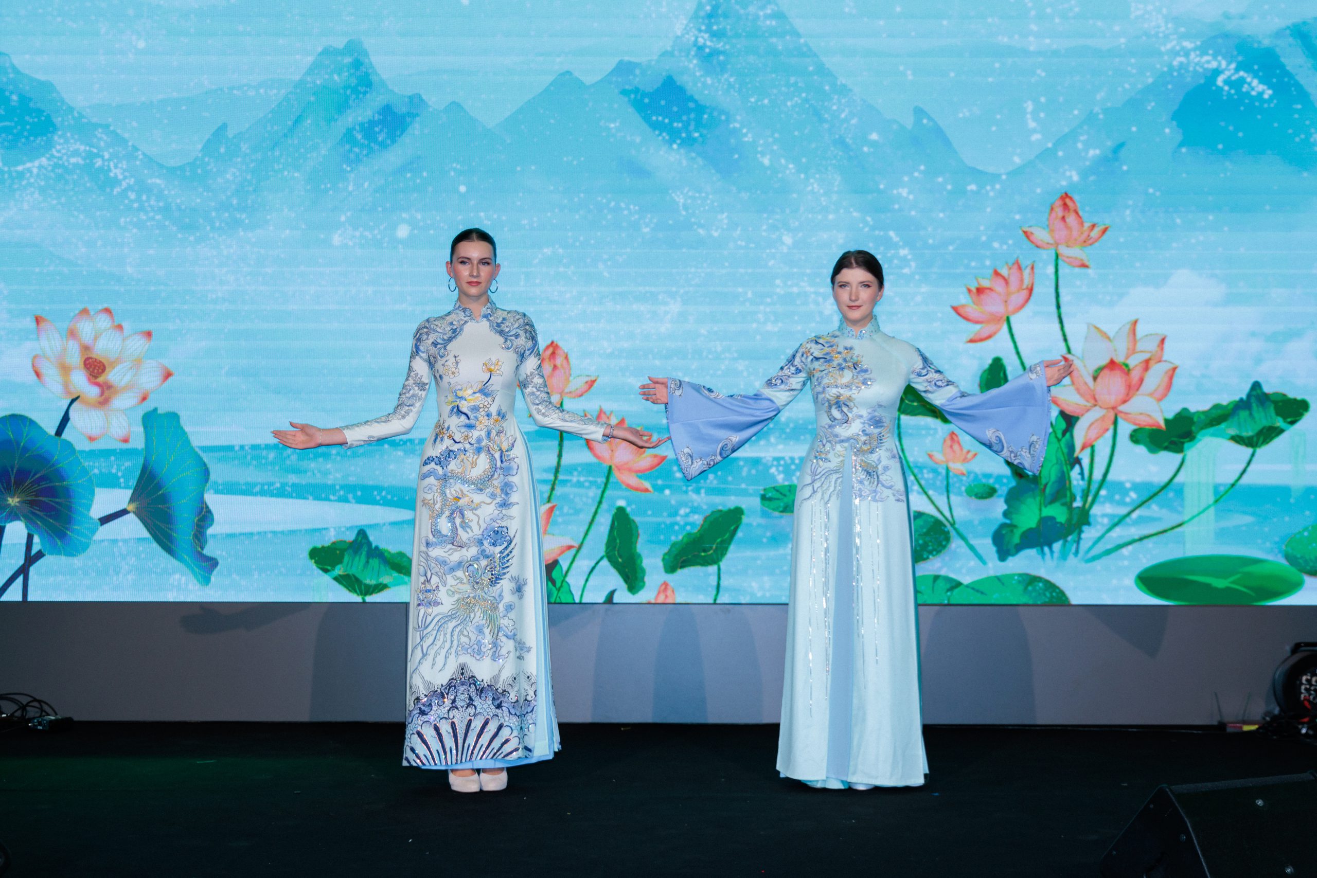 Những tà áo tôn vinh những giá trị văn hóa truyền thống. Những gam màu nhẹ nhàng, xanh thiên thanh thuần khiết mang khát vọng hòa bình, điểm xuyết sắc vàng mong ước sự thịnh vượng phát triển.