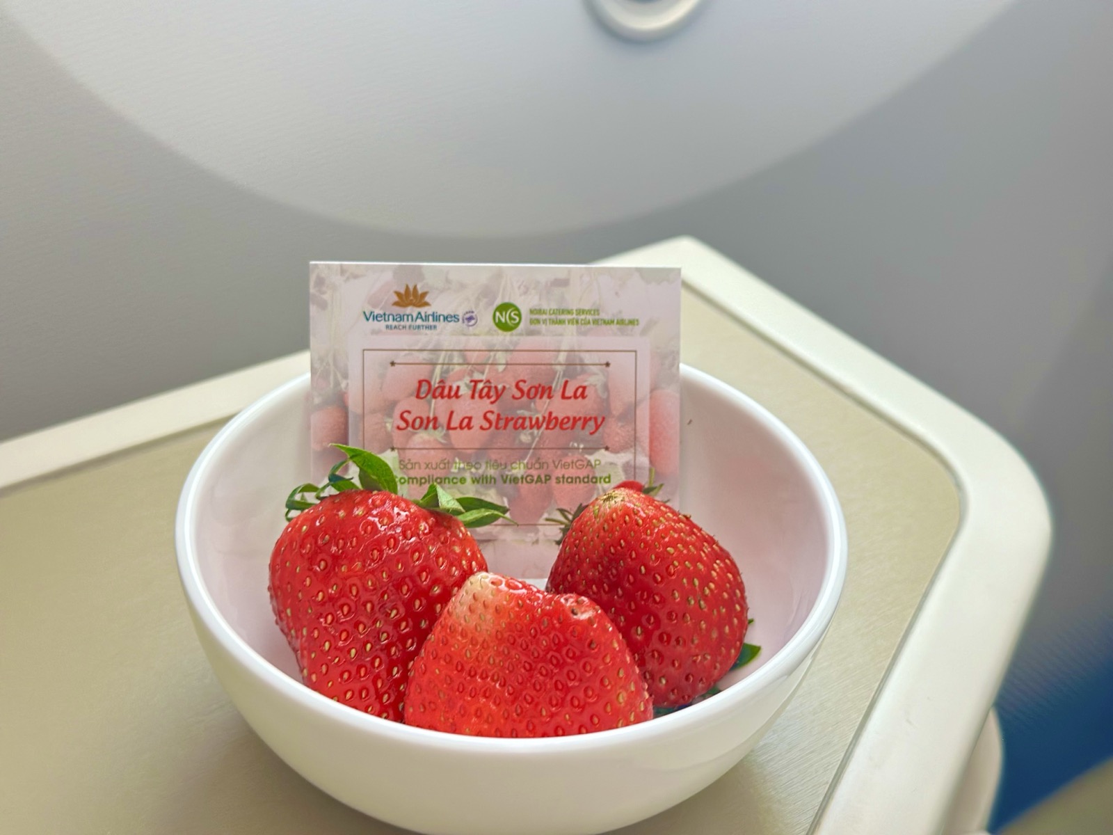 Vietnam Airlines đang phục vụ nhiều món ăn mới trên chuyến bay lấy cảm hứng từ trái dâu tây Mộc Châu tươi ngon.